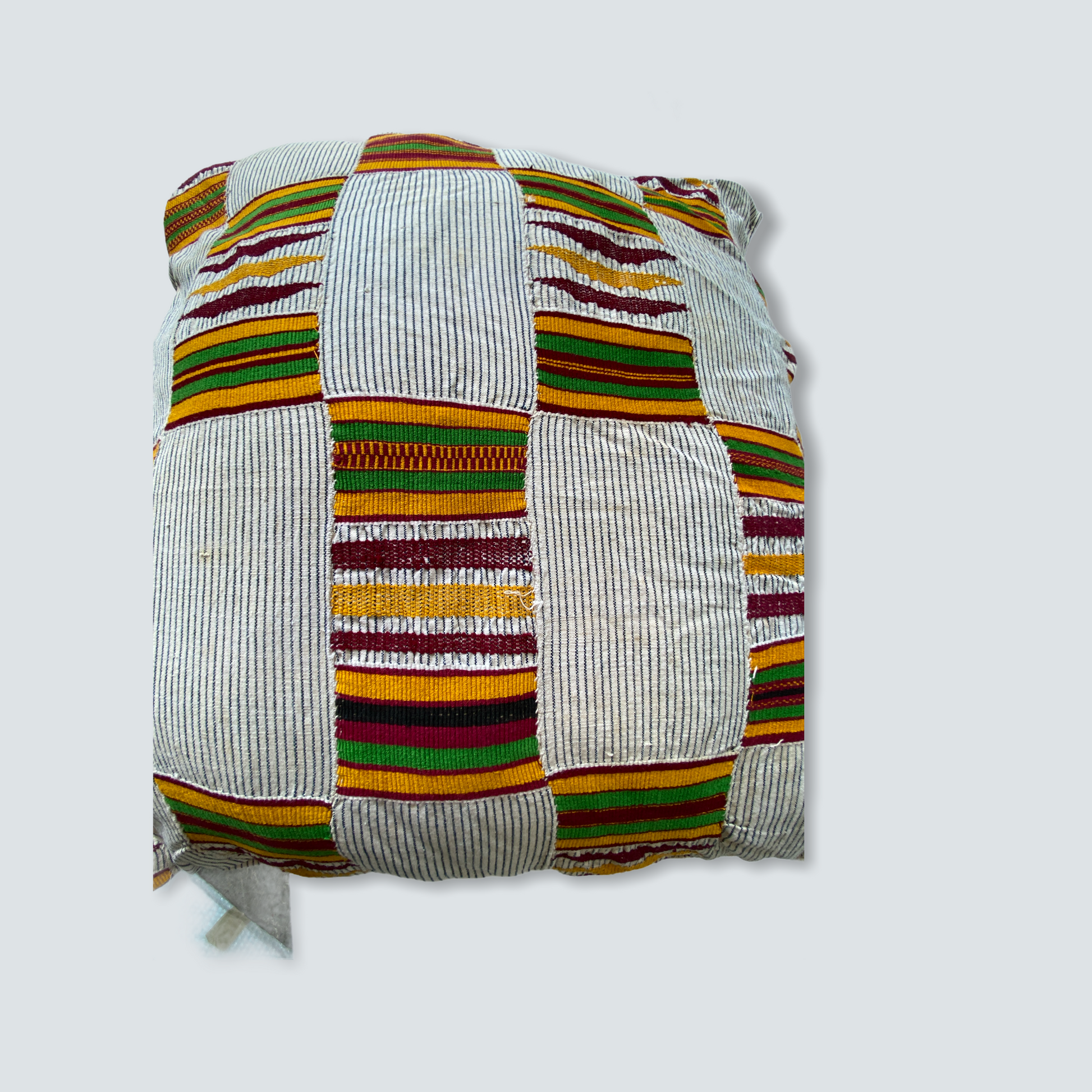 A stunning traditional hand stitched cushion from Ghana. Kente means a Ghanaian textile made using handwoven cloth strips of silk & cotton. The cloth was once worn by royalty in groups such as the Ashanti and Ewe in modern day Ghana. The fabric is used in many ceremonies today.