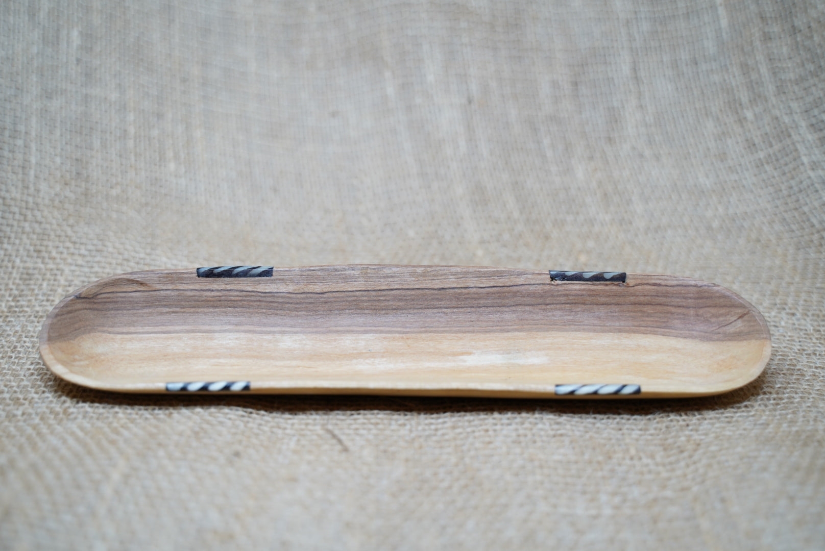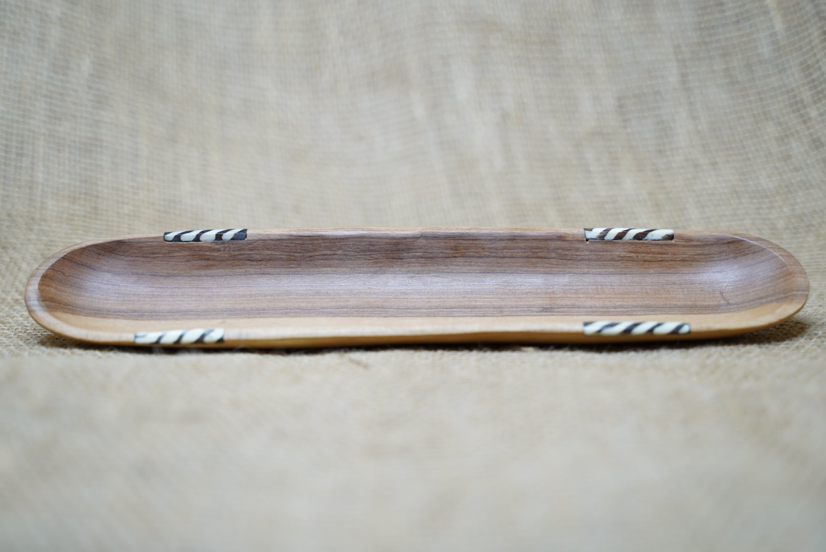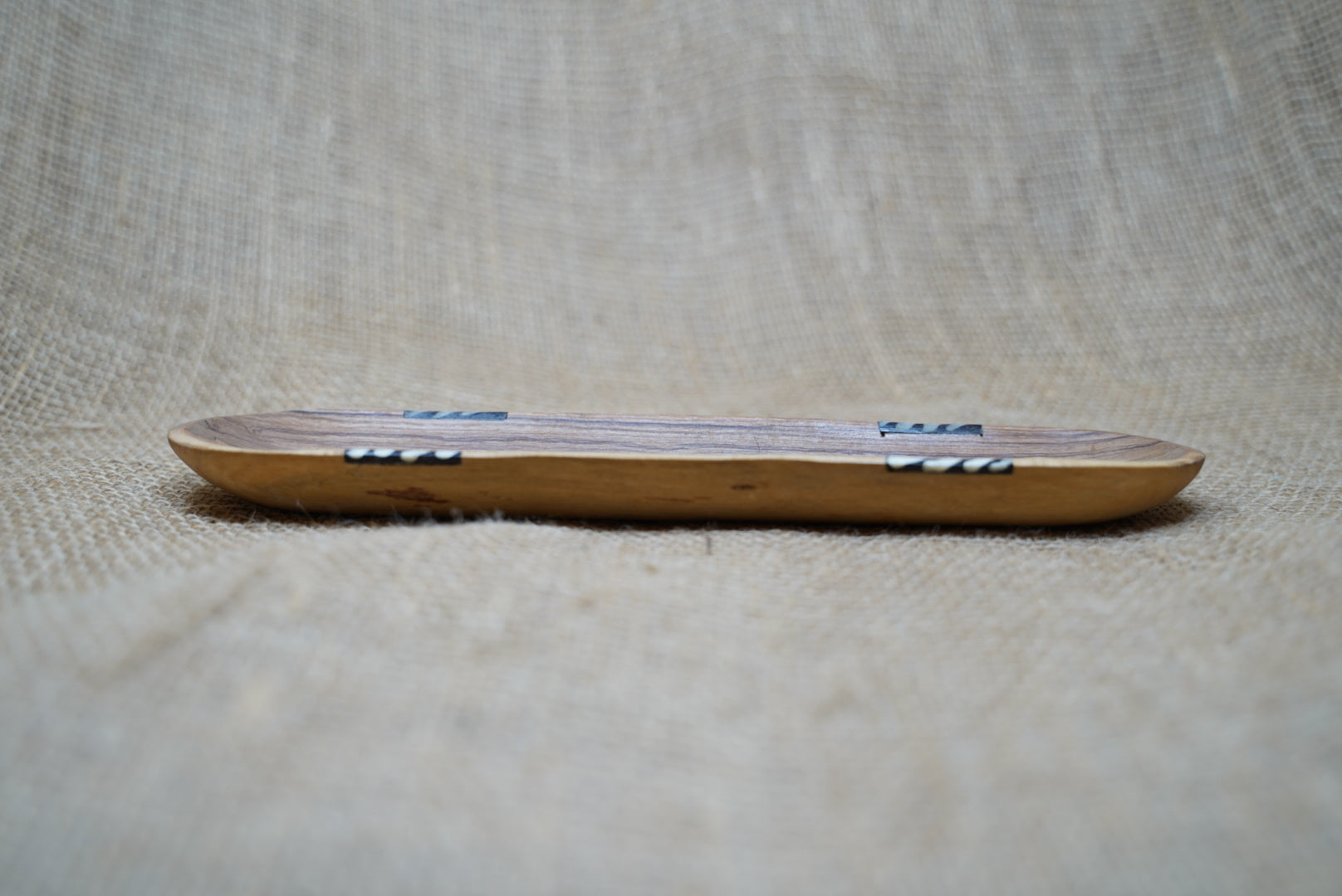 Hand carved bone inlay dipping bowl made in Kenya.  The bowls are great for serving dips/spreads, holding spices, or used as decoration around your home. The bowl has a small flat base on the bottom to keep it balanced