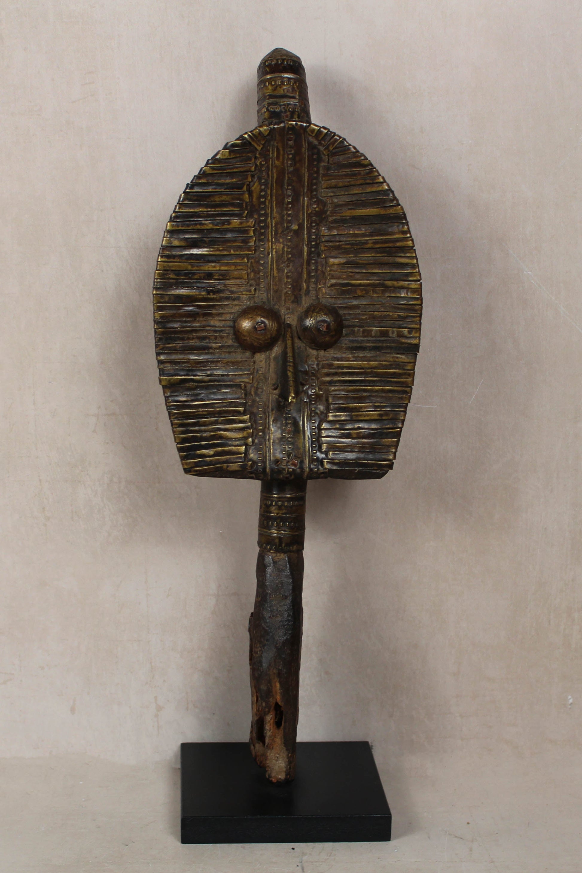 These figures are made by the Kota people from Mahingwe in Gabon and used in ceremonies. Sculpted from wood the facial part of the sculpture is adorned with brass/copper strips and almost resembles the head of a Cobra snake which is referred to by Europeans as the “naja”.