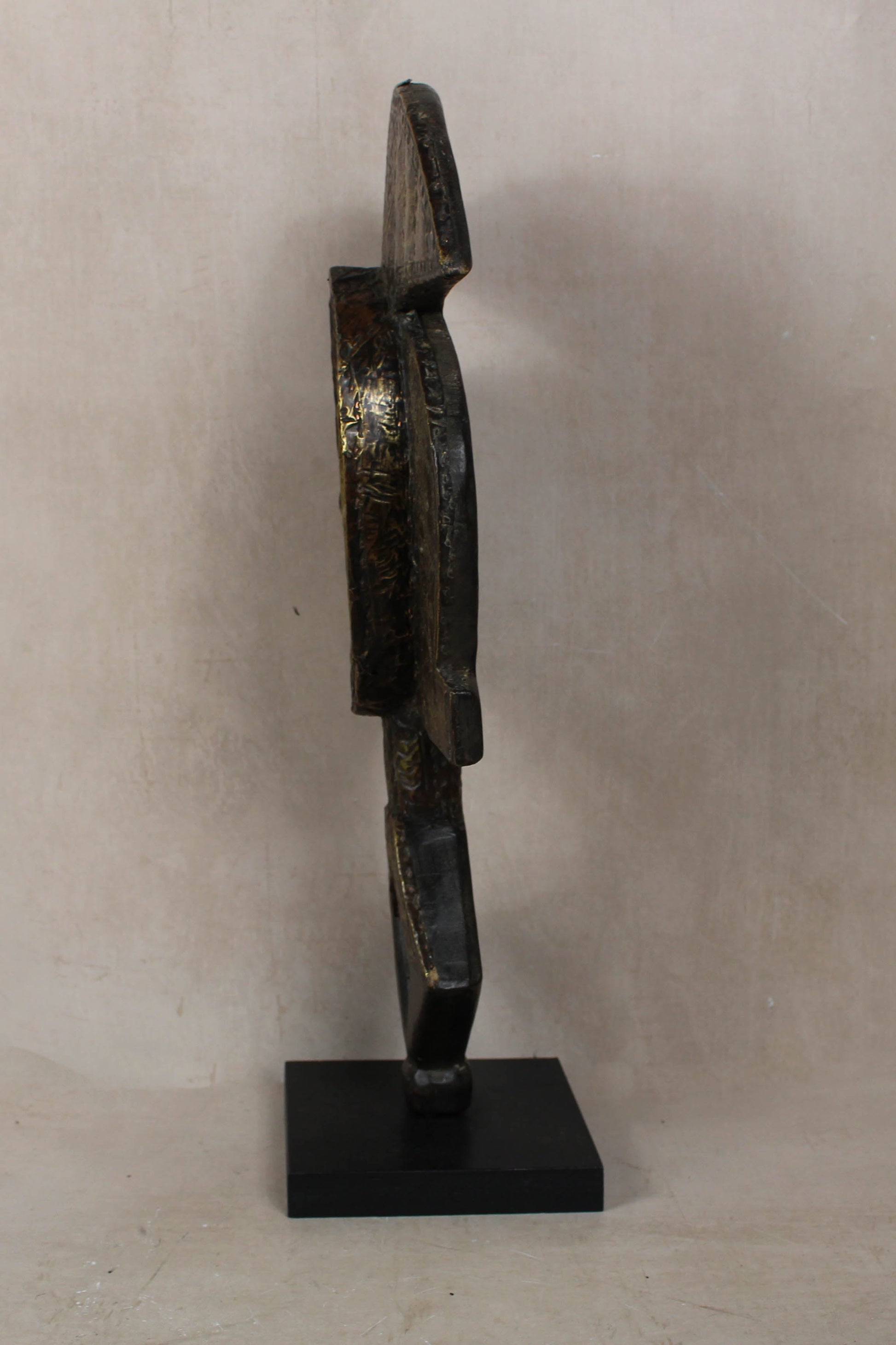 These figures are made by the Kota people from Mahingwe in Gabon and used in ceremonies. Sculpted from wood the facial part of the sculpture is adorned with brass/copper strips and almost resembles the head of a Cobra snake which is referred to by Europeans as the “naja”.