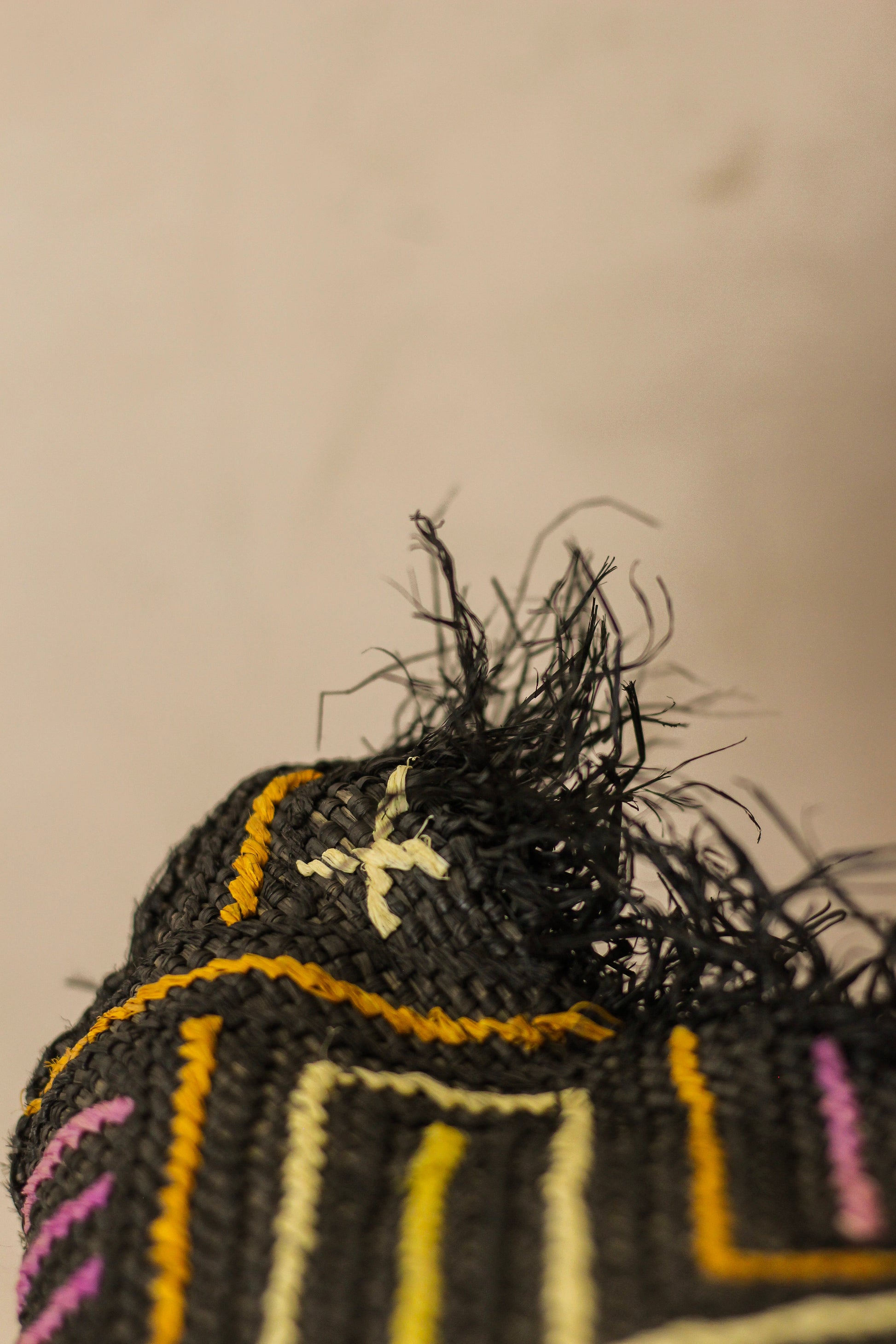 Hand stitched textured cushion made from the fiber of the Raffia Vinifera Palm in the Democratic Republic of Congo. Production of these textiles is a multistage process which involves the participation of many people, both women and men. The process includes gathering and preparing the raffia fibers for weaving and embroidery, weaving the basic oth unit, dying the embroidery fibers, and embellishing the woven cloth with embroidery, applique, patchwork and dye. Embroided cloth works are individually conceptualised and the patterns have been named and passed on through generations.