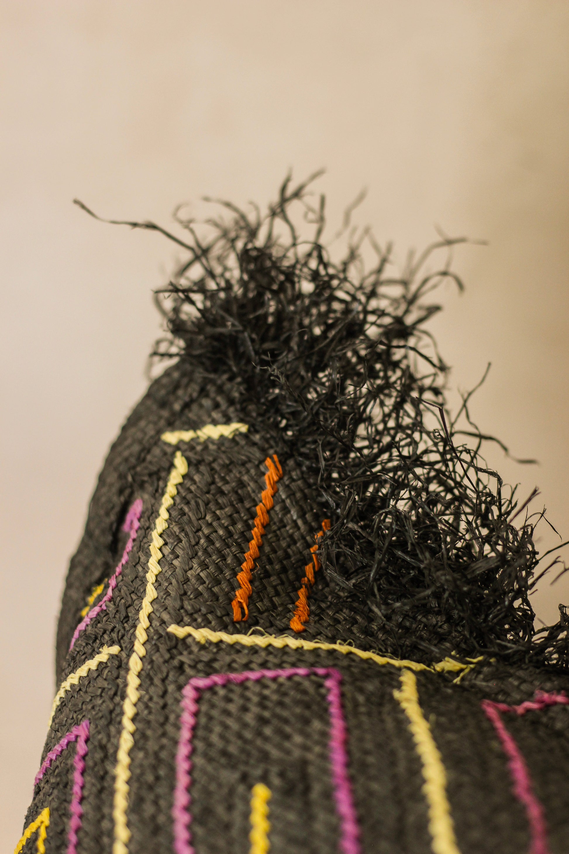 Hand stitched textured cushion made from the fiber of the Raffia Vinifera Palm in the Democratic Republic of Congo. Production of these textiles is a multistage process which involves the participation of many people, both women and men. The process includes gathering and preparing the raffia fibers for weaving and embroidery, weaving the basic oth unit, dying the embroidery fibers, and embellishing the woven cloth with embroidery, applique, patchwork and dye. Embroided cloth works are individually conceptualised and the patterns have been named and passed on through generations.