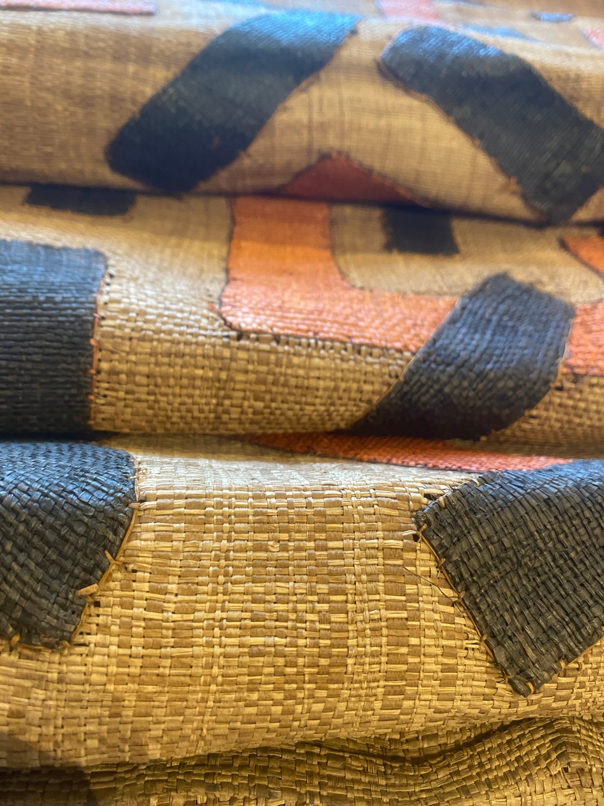 A stunning hand stitched textured fabric from the fiber of the Raffia Vinifera Palm in the Democratic Republic of Congo. This style is known as applique applique ngongo.