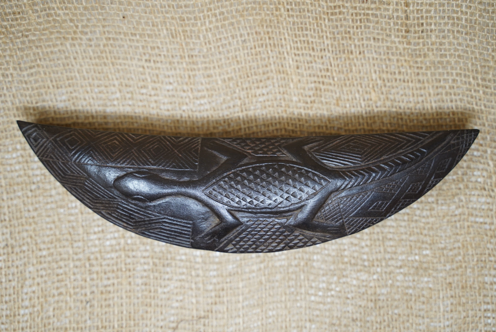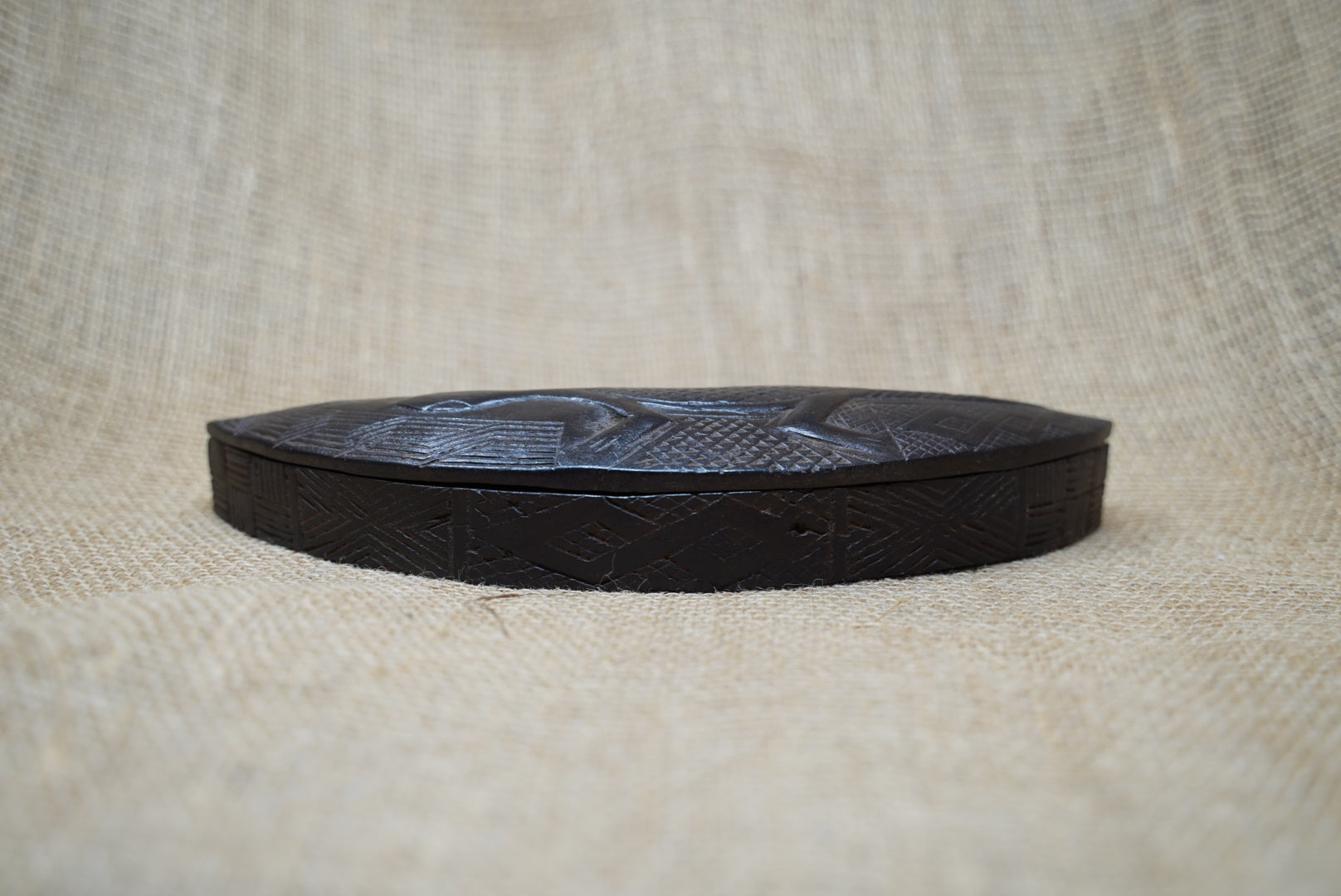 The vintage Kuba wooden jewelry box is an exquisite testament to the artistic brilliance of the Kuba people, hailing from the heart of Central Africa. Imbued with meticulous craftsmanship, this box stands as a splendid fusion of form and function. Carved from lustrous wood, its exterior showcases a captivating tapestry of geometric designs, intricate interlocking motifs, and meaningful symbols and skillfully etched.
