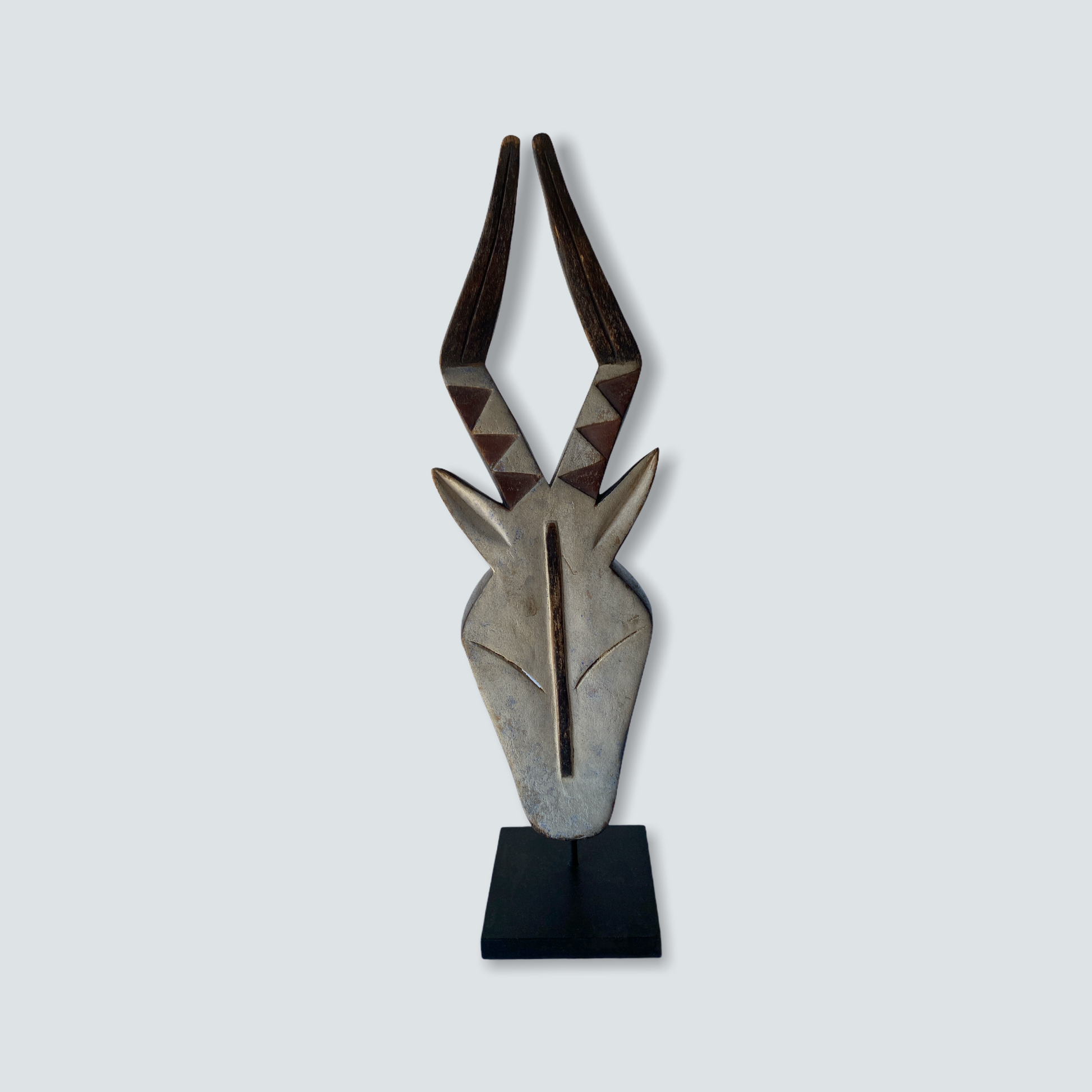 Masks such as this were rarely worn. They were kept hanging in the house. When worn, their function was to "warm up" the village atmosphere in order to activate the beneficial forces from the Bwete containers. There are two primary masks used by Beete dancers, one resembling an antelope (Ekuk) and the other a gorilla (Gon). Heart-shaped "ekuk" masks representing the peaceful spirits which might be encountered during the hunt, as opposed to the "gon," which symbolizes danger. The Kwele live in the north-eastern of Gabon and the Republic of Congo (Congo-Brazzaville). They have produced varieties of mask used in the initiation ceremonies into the Bwete cult. The Bwete Society has social control over most activities of the Kwele, a small patrilineal group living to the east of the Fang and Kota, in the dense forests of inland Gabon.