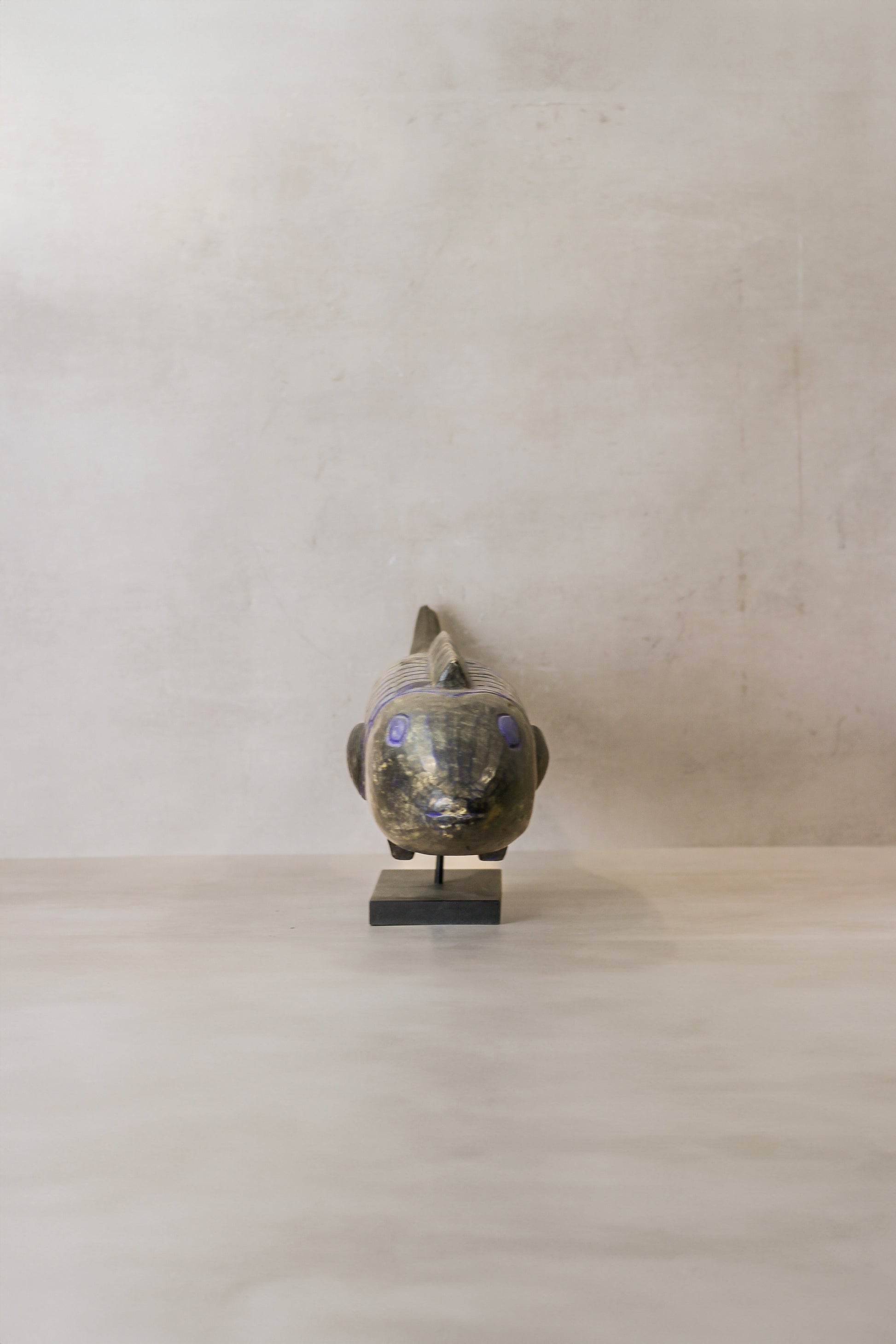 A large very old hand crafted fish by artisans in Mali, these river sculptures are hand-carved from wood, painted, and then antiqued through an underground smoking process.