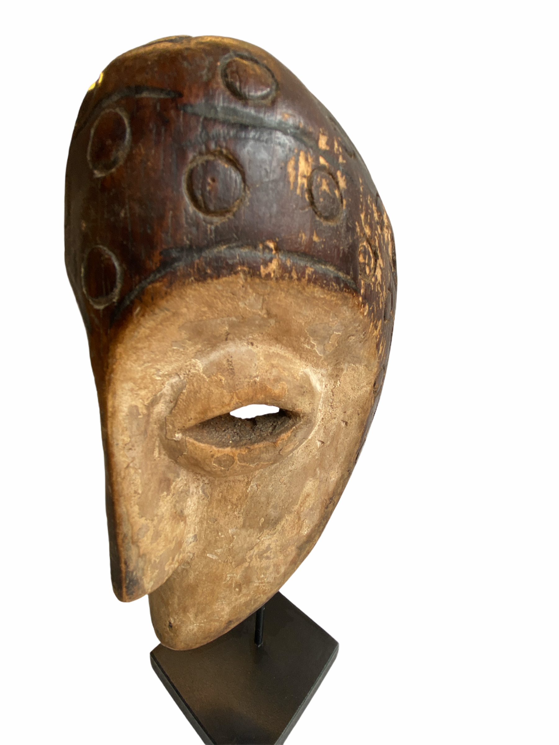 The Lega mask is symbolic of the Bwami society of Lega people in the Democratic Republic of the Congo. The masks play an important role in their society relations and roles. The masks are a simple design but embody a multitude of complex meanings such as dances and proverbs.