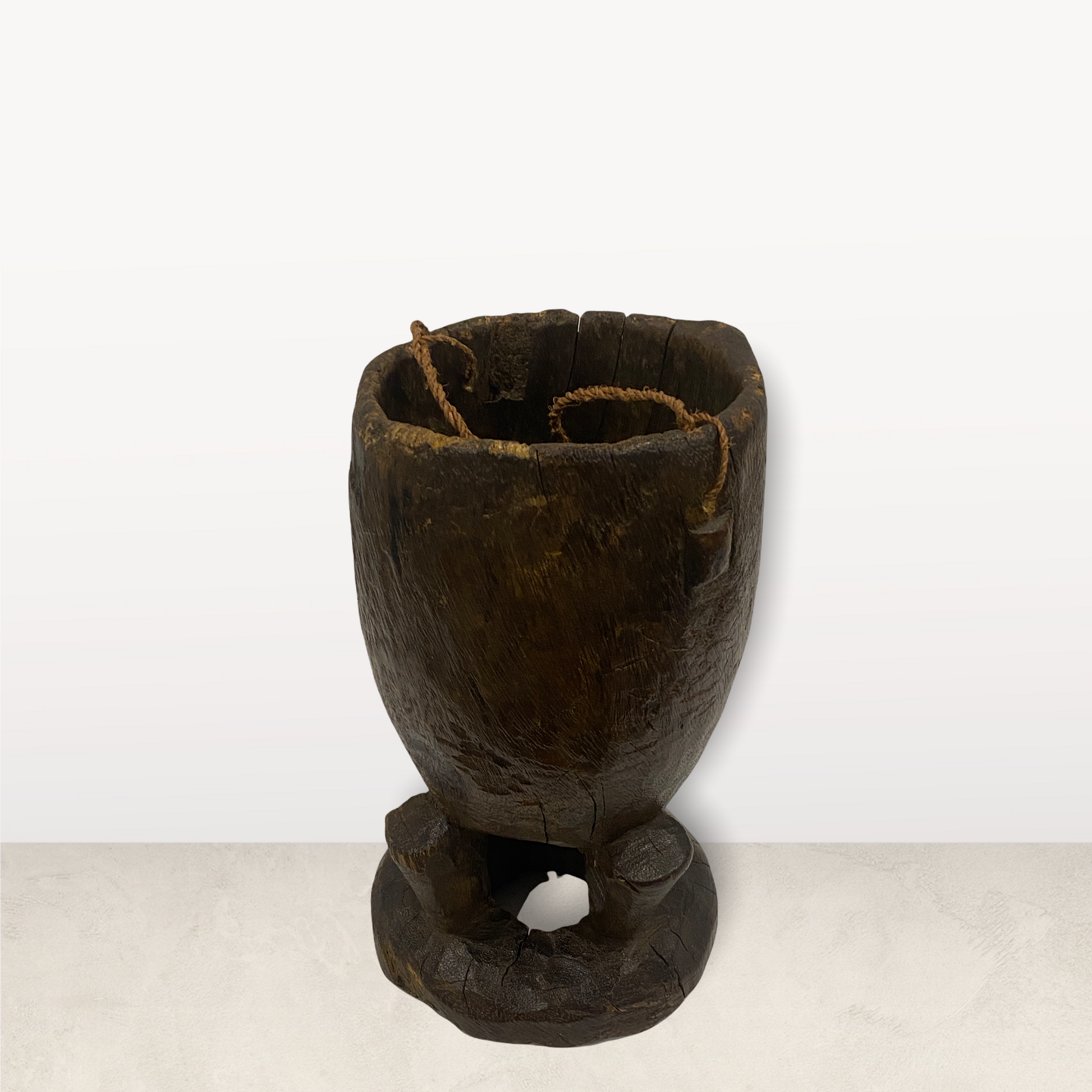 The Lozi people of Zambia are known for their basketry, rarely work in wood, but for their wooden milk jugs are sought after objects from collectors. Originally used to collect milk from cows. These particular jugs come with rope handles.