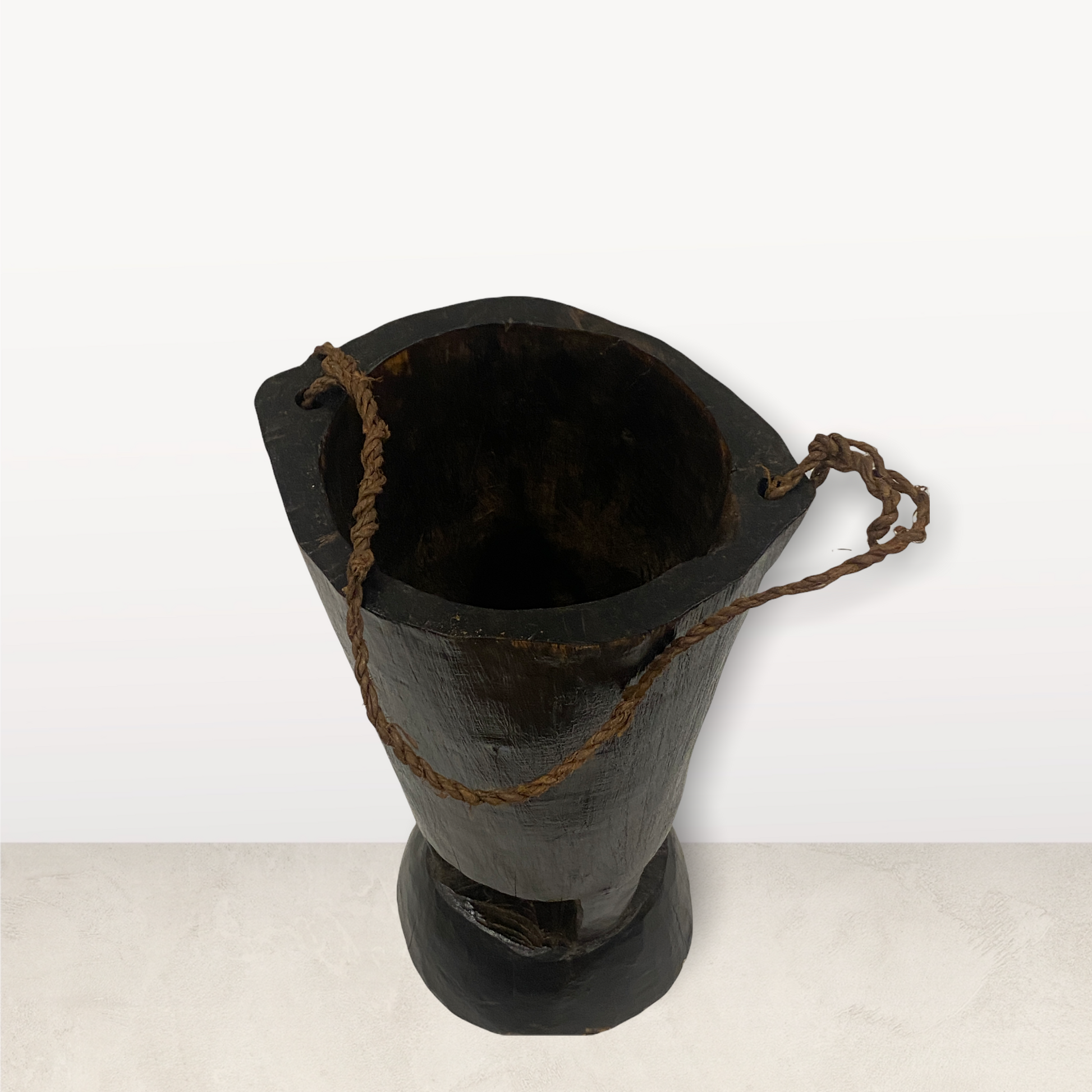 The Lozi people of Zambia are known for their basketry, rarely work in wood, but for their wooden milk jugs are sought after objects from collectors. Originally used to collect milk from cows. These particular jugs come with rope handles.