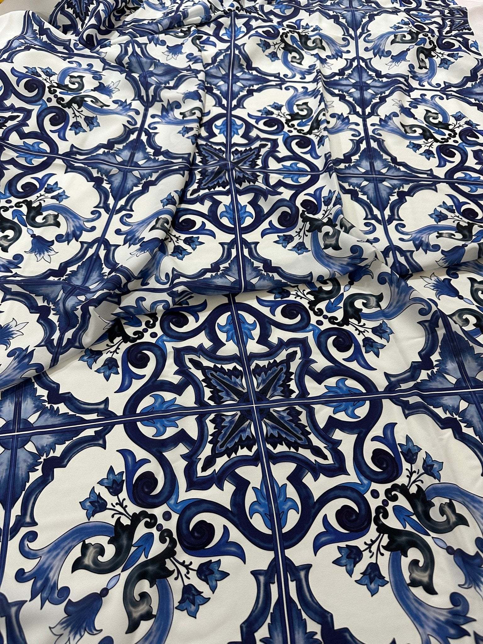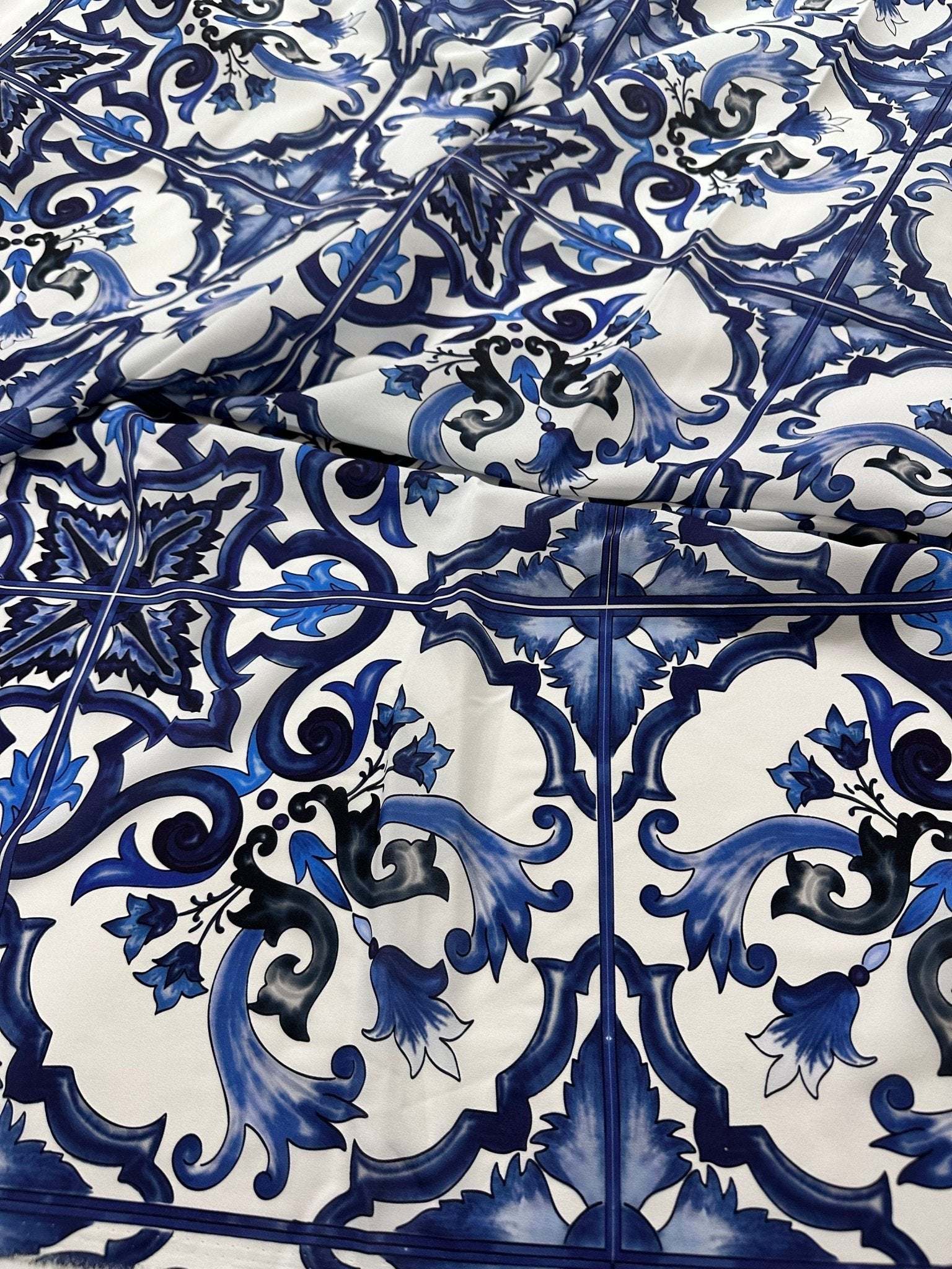 Majolica Pattern Blue White Swirl Crepe Fabric – Custom Printed Fabric, Choose Material by Metre