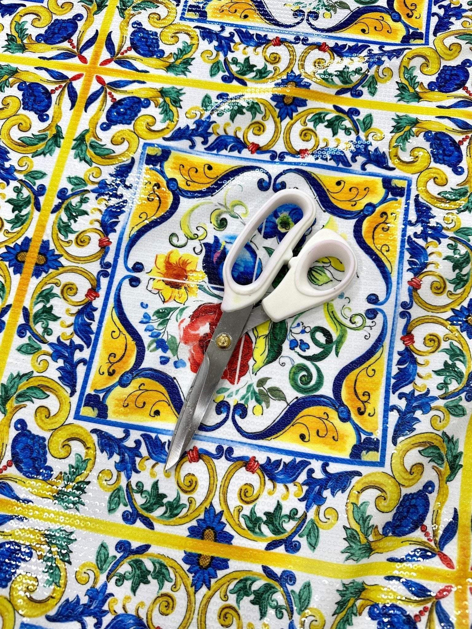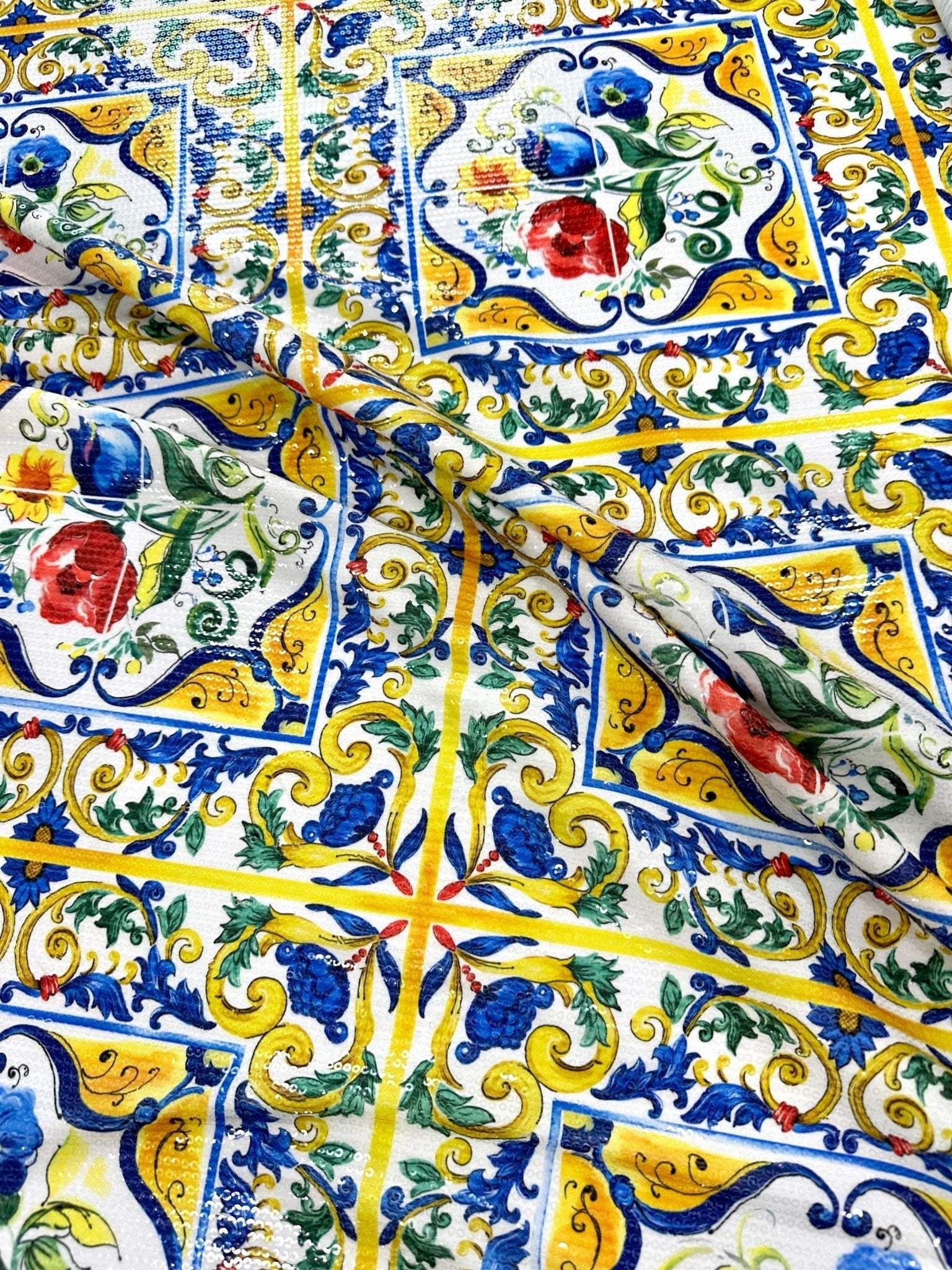 Majolica sequin fabric is the perfect choice for designers and crafters seeking a glamorous, high-quality material that enhances evening dress fabric and wedding dress fabric projects. This Majolica sequin fabric features vibrant floral and geometric designs in yellow, blue, red, and green, accented with shimmering sequins that catch light beautifully within its two-way stretch fabric construction. Measuring 140 cm (approximately 1.53 yards) wide, this durable sequin cloth provides comfort and flexibility, making it ideal for elegant evening wear such as skirts, blouses, jackets, and mini sequin textile creations.
