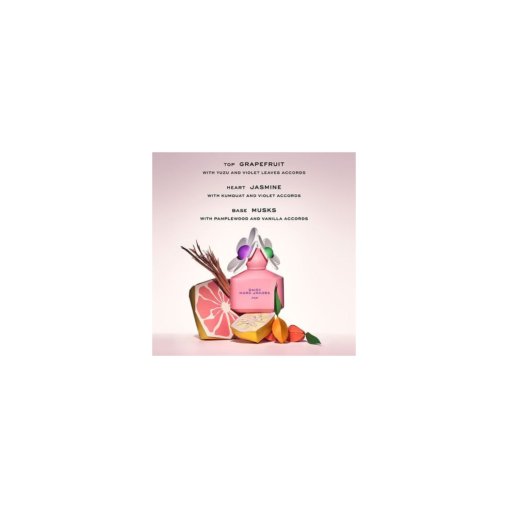 Zesty and bright, Daisy Pop is a limited-edition fragrance capturing Marc Jacobs' vibrant, fashion-forward spirit. Sparkling grapefruit and yuzu mingle with violet leaf, leading to a lush heart of jasmine, kumquat, and floral violet. The scent finishes with earthy musks, warm pamplewood, and soothing vanilla, creating a unique citrusy blend. Housed in a matte pink bottle with colorful accents, it transitions effortlessly from day to evening wear and makes a delightful gift.