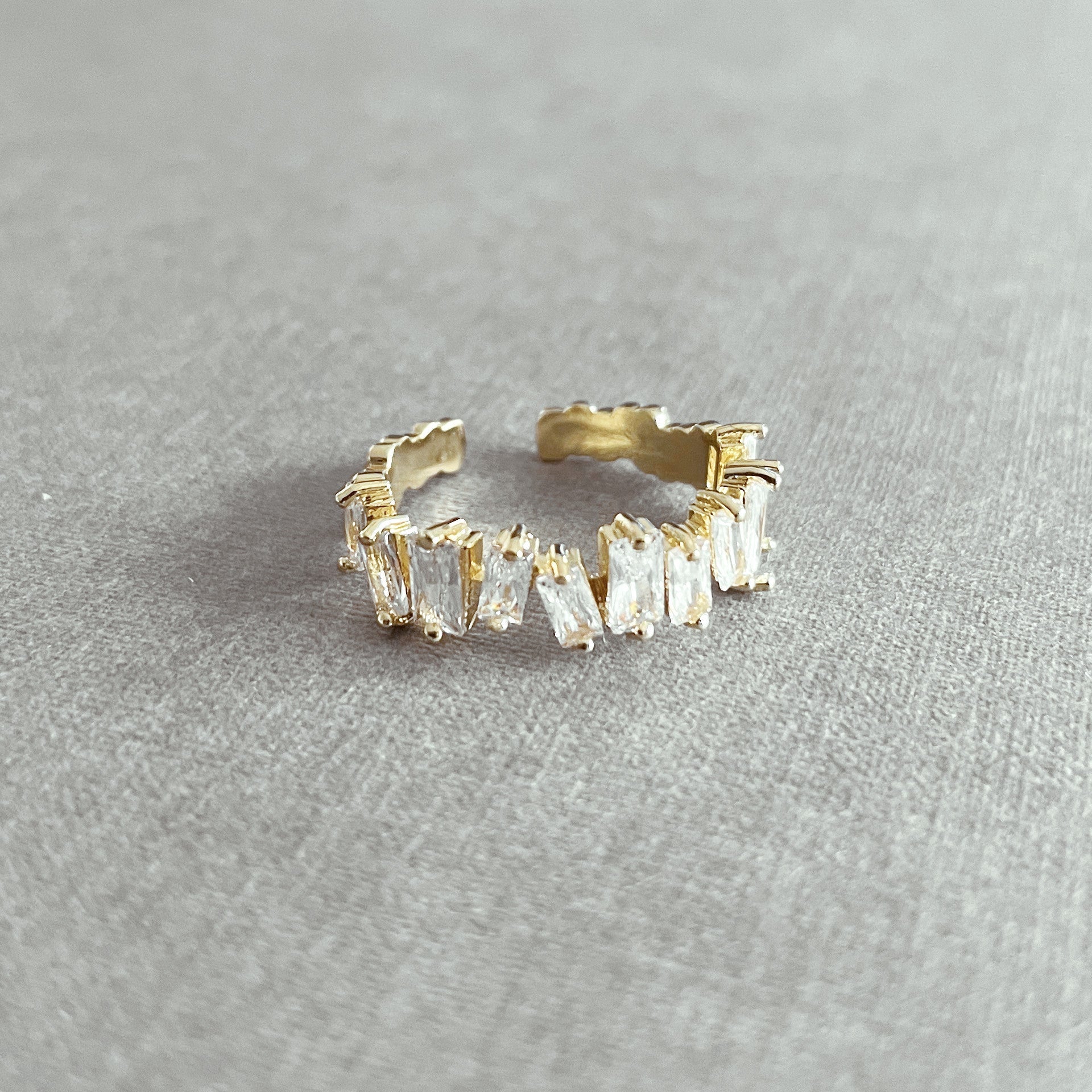 Make a statement with our Mila ring, featuring an irregular row of shimmering white coloured rhinestones.