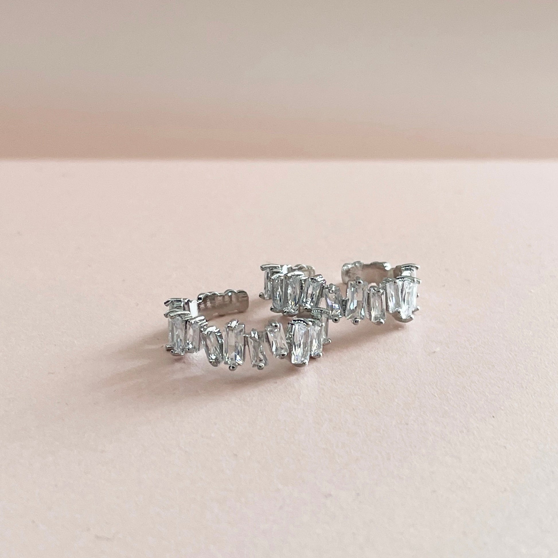 Make a statement with our Mila ring, featuring an irregular row of shimmering white coloured rhinestones on a silver tone base.