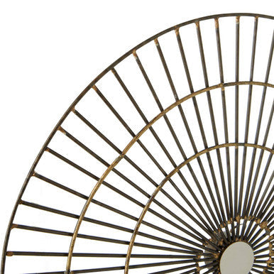 A central round hub sends slim iron wires outward, forming a starburst that lands on a softly waved perimeter. The gold accent warms the composition and highlights the gentle shadows that the wirework casts on the wall.
