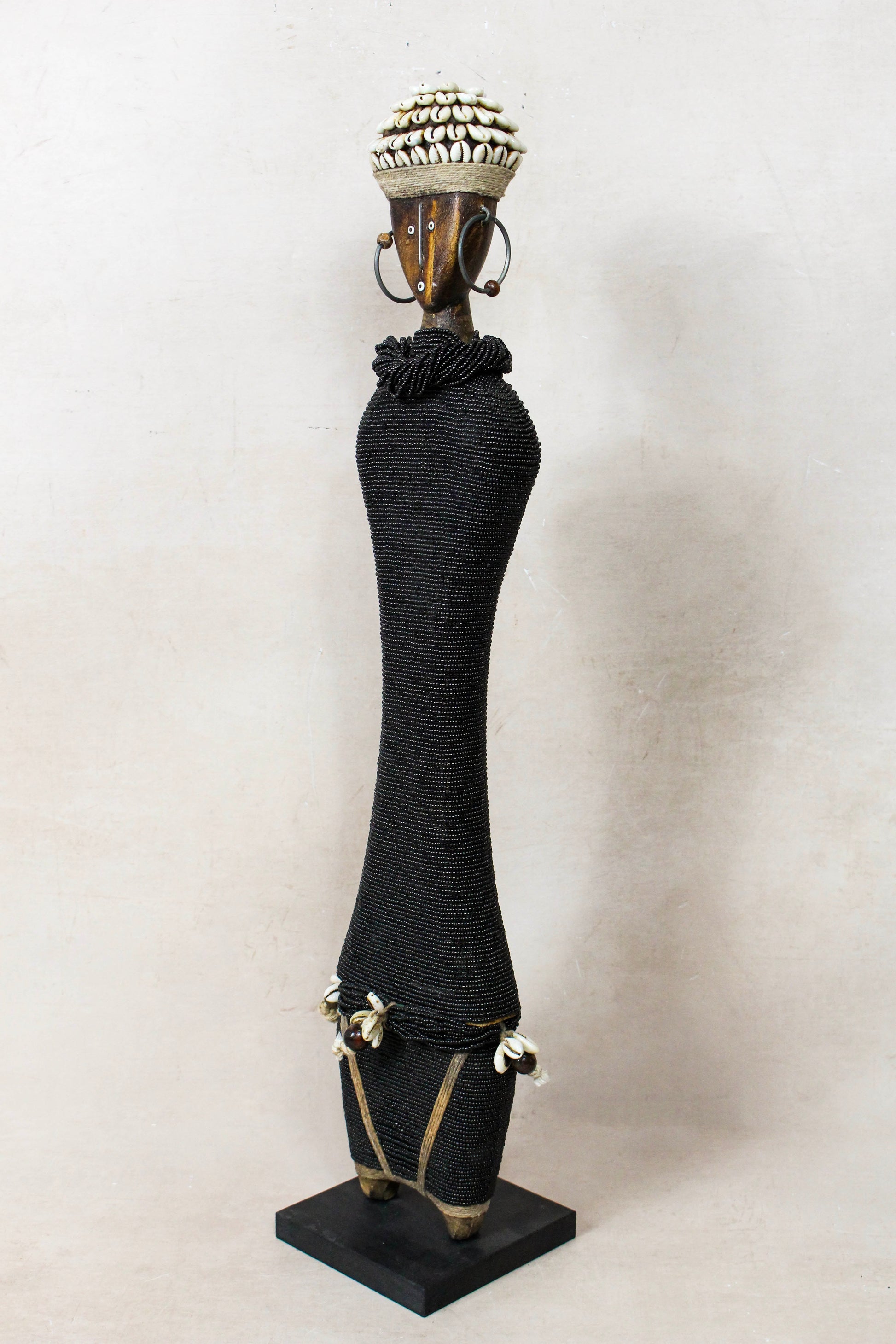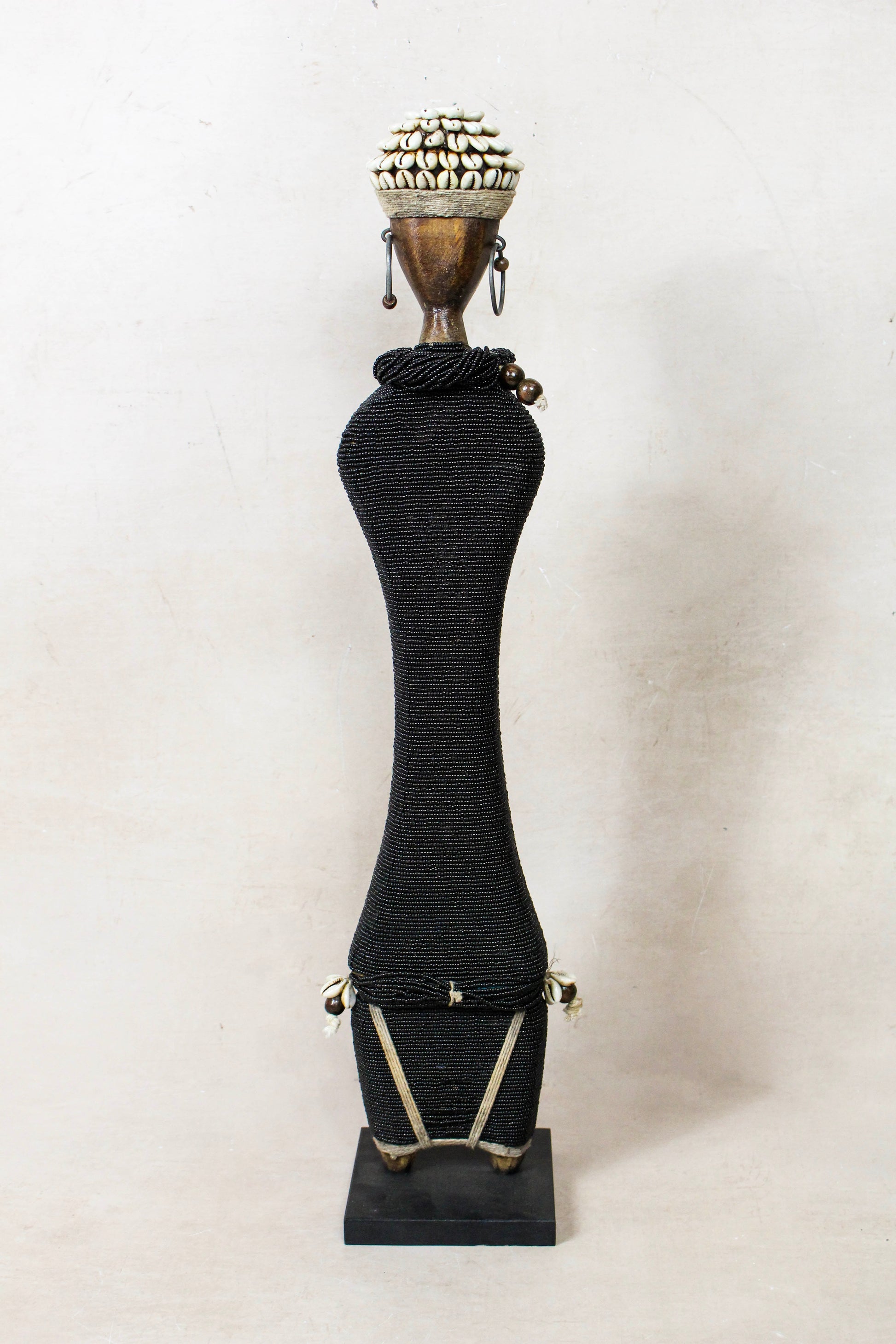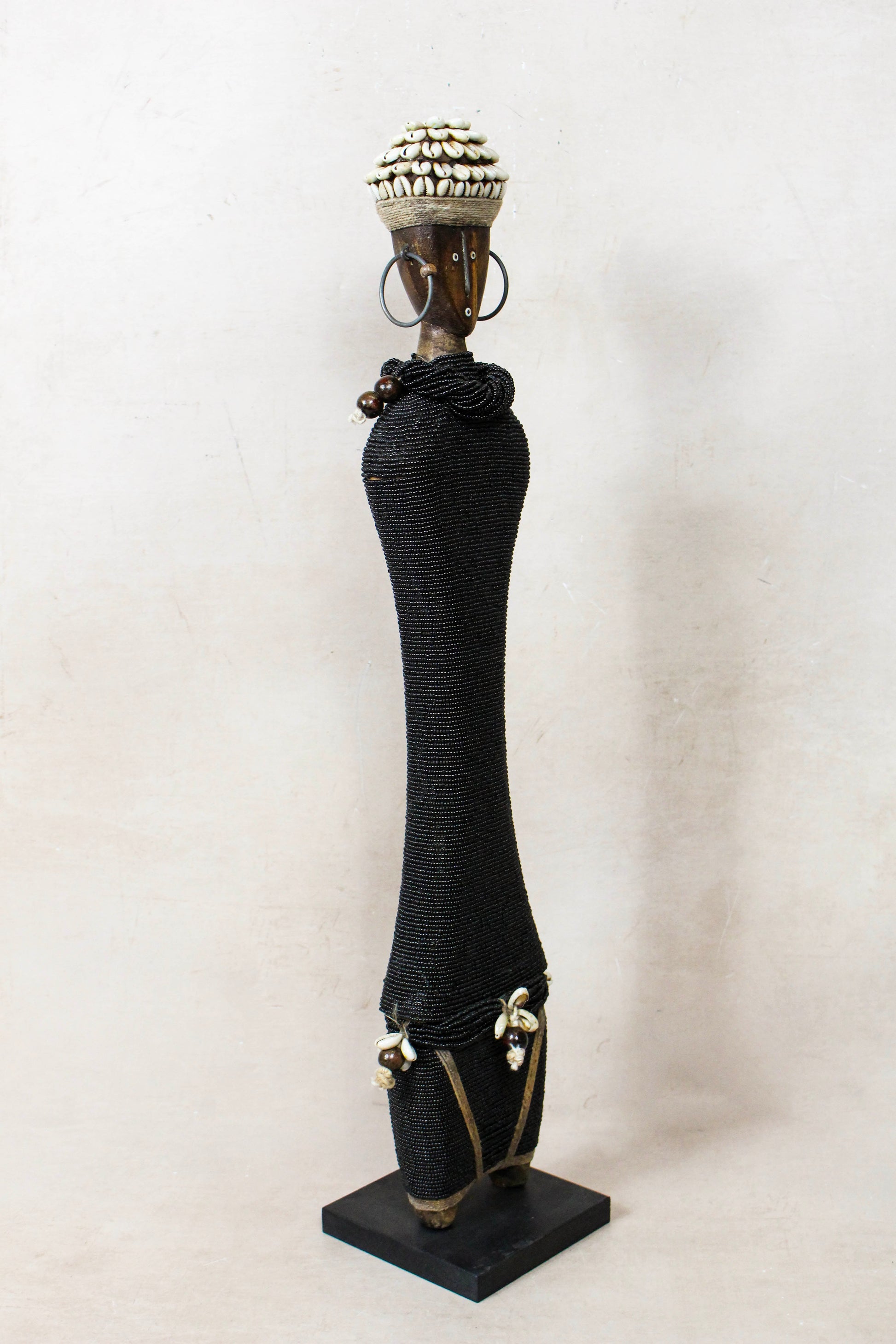 Namchi/Namji dolls are carved from African Rosewood, a legume tree native to the Democratic Republic of Congo, Cameroon, Gabon and Equatorial Guinea. A single block of African Rosewood wood is hand carved into a geometric shape and decorated with multi coloured beads, metals, fibre, cowrie shells, coins, and even leather. Each doll is carved with a unique stature and facial expression. Unadorned dolls made by blacksmiths are played with by young children.