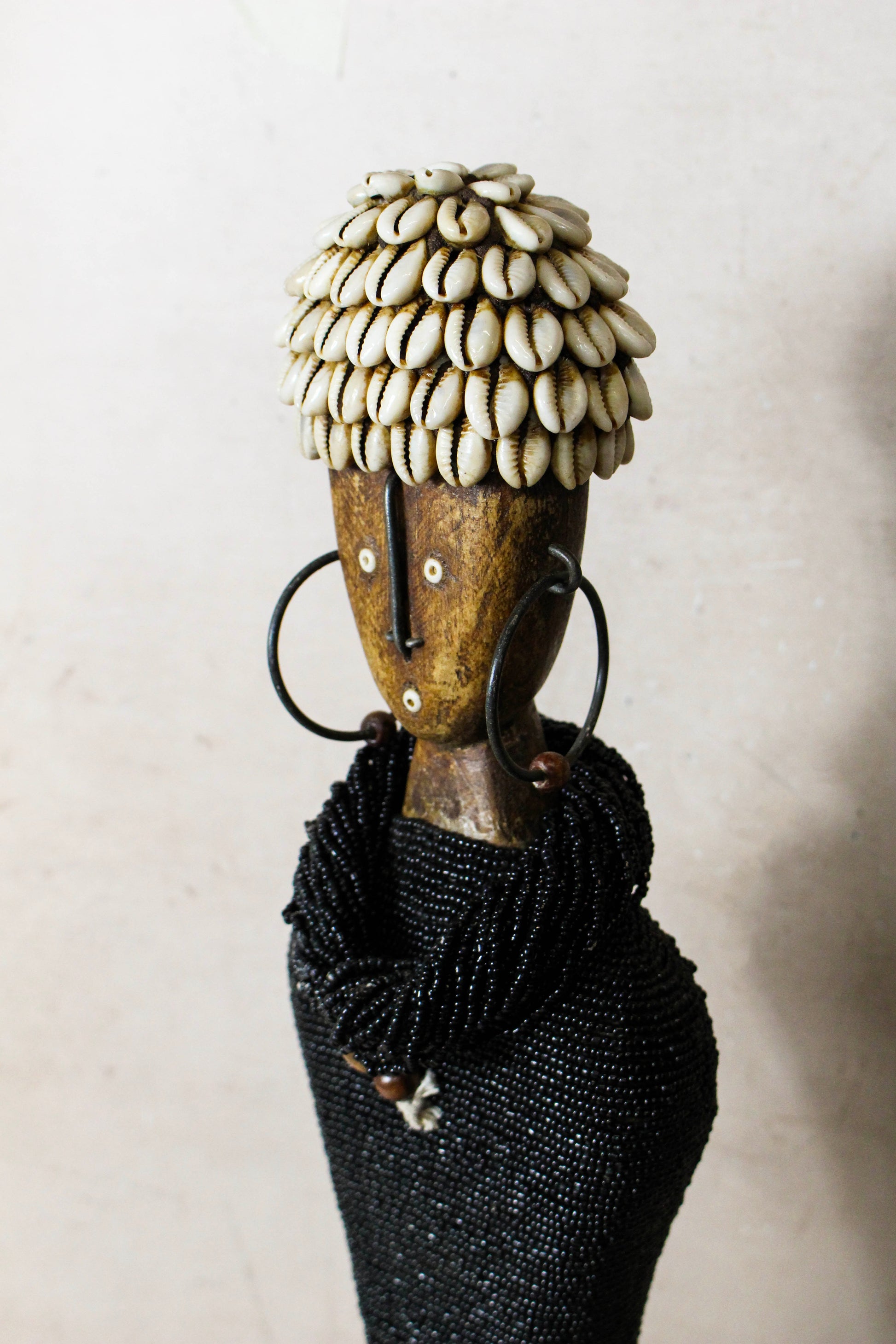 Namchi/Namji dolls are carved from African Rosewood, a legume tree native to the Democratic Republic of Congo, Cameroon, Gabon and Equatorial Guinea. A single block of African Rosewood wood is hand carved into a geometric shape and decorated with multi coloured beads, metals, fibre, cowrie shells, coins, and even leather. Each doll is carved with a unique stature and facial expression. Unadorned dolls made by blacksmiths are played with by young children.