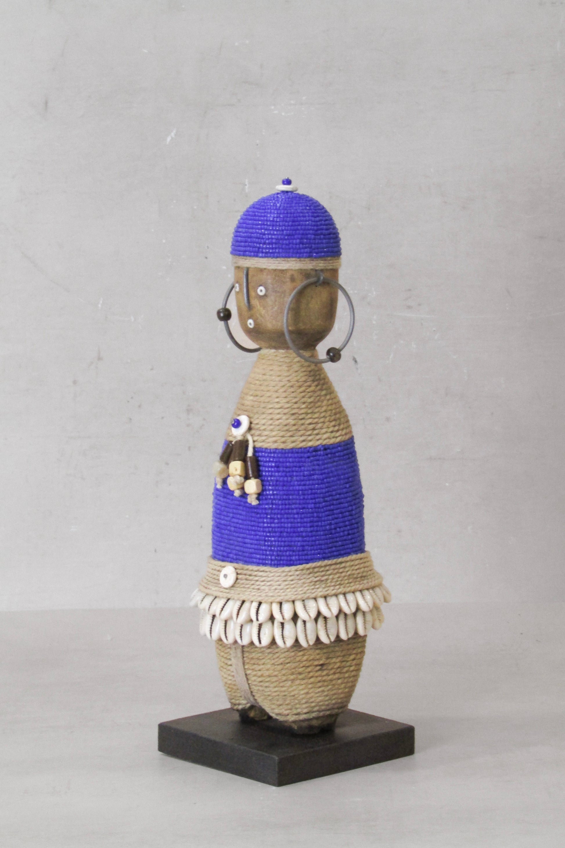 Namchi/Namji dolls are carved from African Rosewood, a legume tree native to the Democratic Republic of Congo, Cameroon, Gabon and Equatorial Guinea. A single block of African Rosewood wood is hand carved into a geometric shape and decorated with multi coloured beads, metals, fibre, cowrie shells, coins, and even leather. Each doll is carved with a unique stature and facial expression. Unadorned dolls made by blacksmiths are played with by young children.