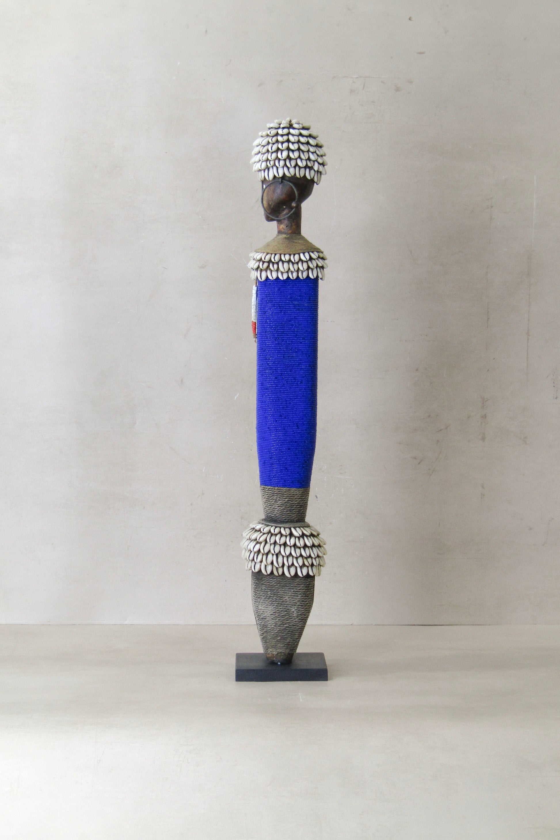 Namchi/Namji dolls are carved from African Rosewood, a legume tree native to the Democratic Republic of Congo, Cameroon, Gabon and Equatorial Guinea. A single block of African Rosewood wood is hand carved into a geometric shape and decorated with multi coloured beads, metals, fibre, cowrie shells, coins, and even leather. Each doll is carved with a unique stature and facial expression. Unadorned dolls made by blacksmiths are played with by young children.