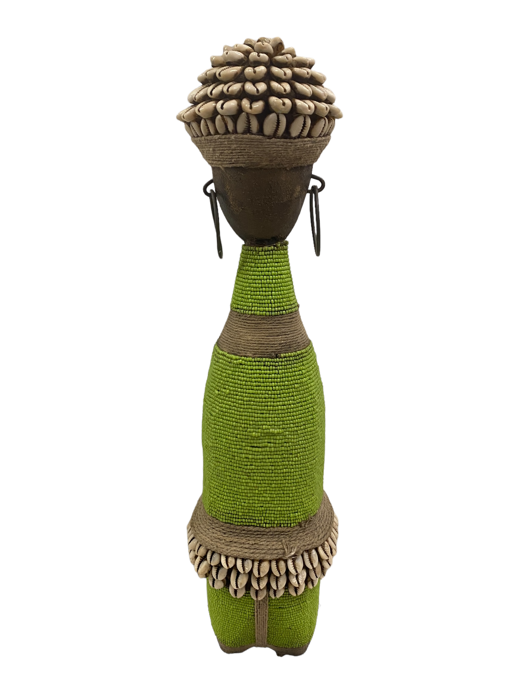 Intricate Adornments: The doll is adorned with multi-colored beads, metals, fibers, cowrie shells, coins, and leather, each element thoughtfully placed to enhance its aesthetic appeal. These embellishments not only add to its beauty but also reflect traditional practices.