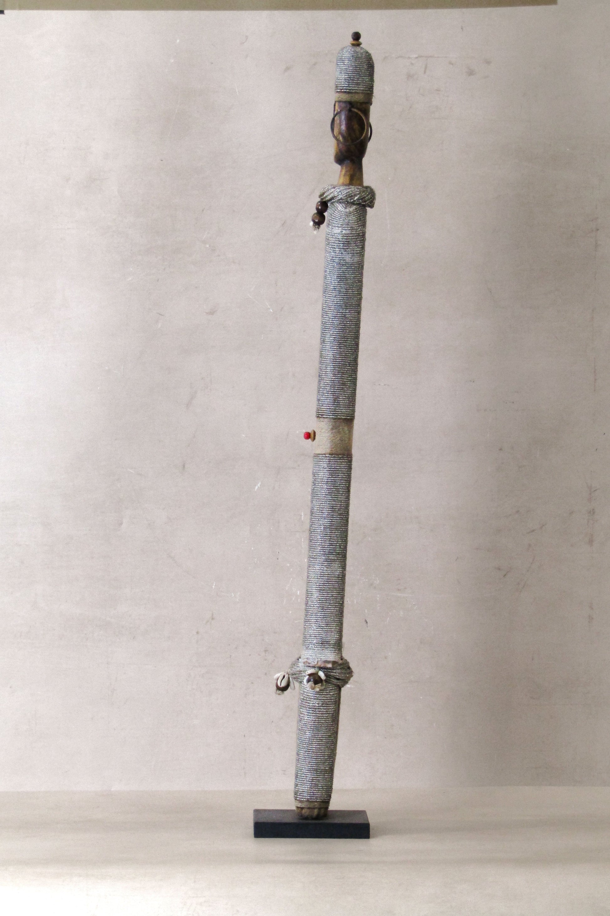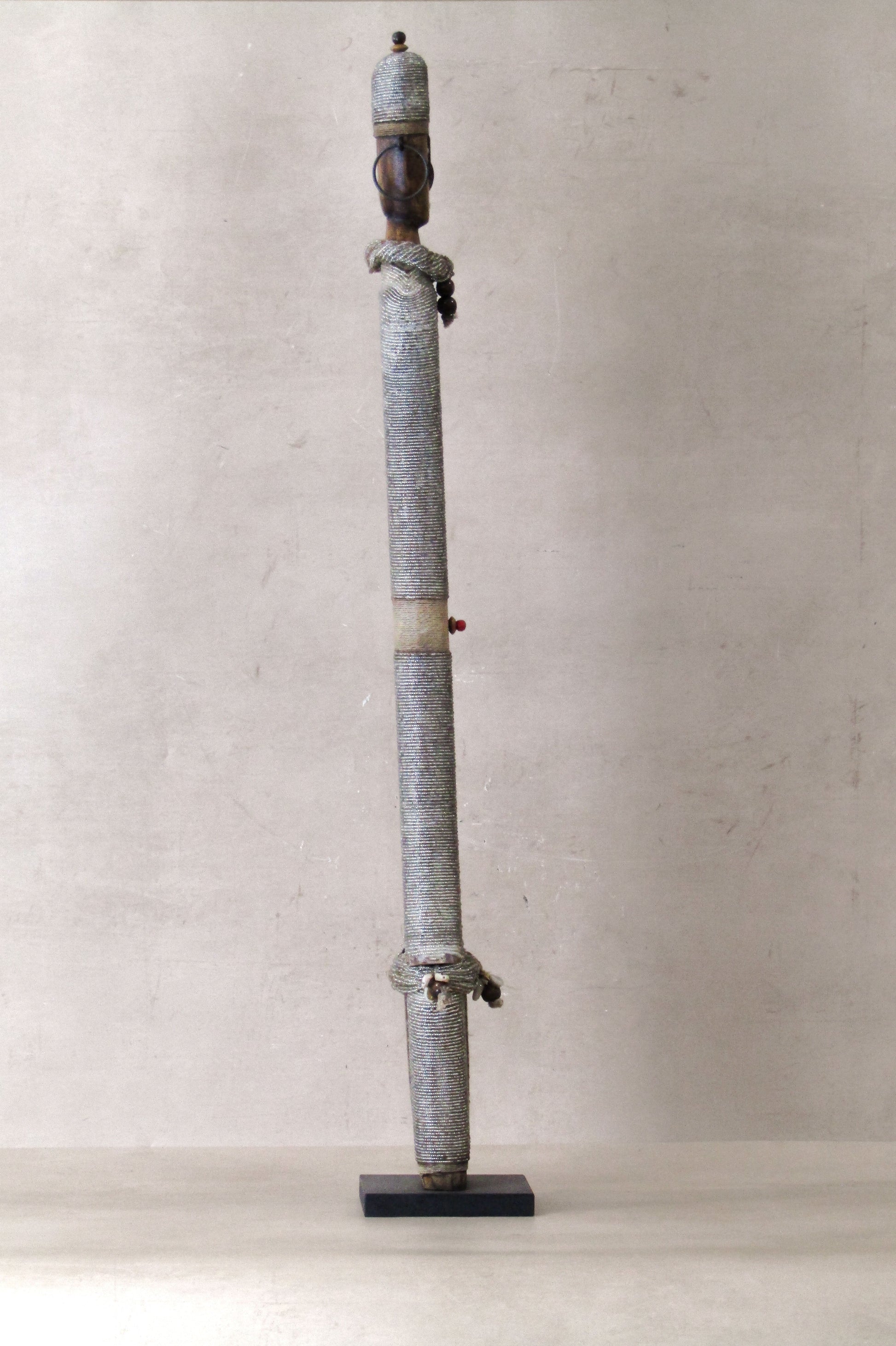Namchi/Namji dolls are carved from African Rosewood, a legume tree native to the Democratic Republic of Congo, Cameroon, Gabon and Equatorial Guinea. A single block of African Rosewood wood is hand carved into a geometric shape and decorated with multi coloured beads, metals, fibre, cowrie shells, coins, and even leather. Each doll is carved with a unique stature and facial expression. Unadorned dolls made by blacksmiths are played with by young children.