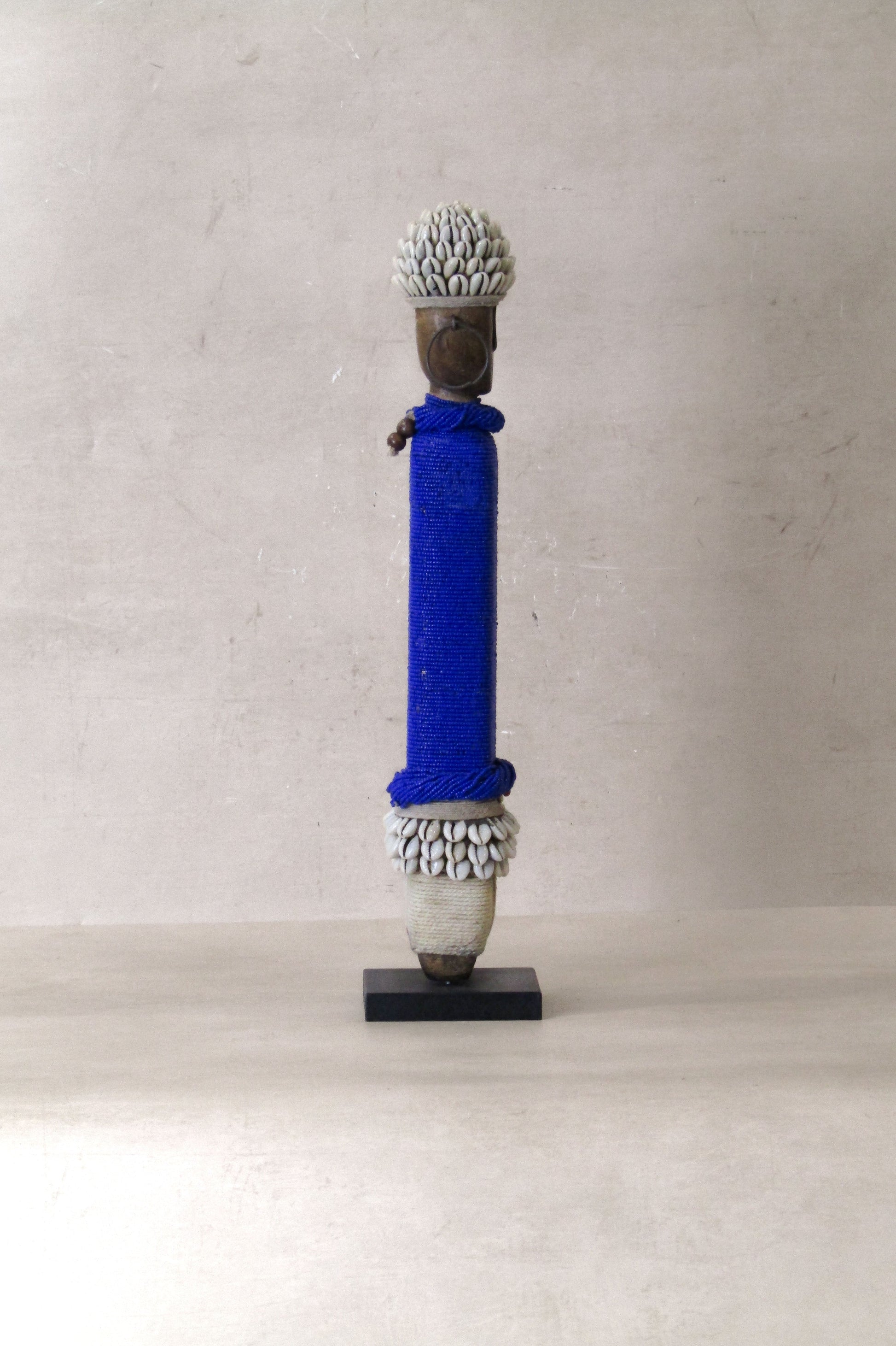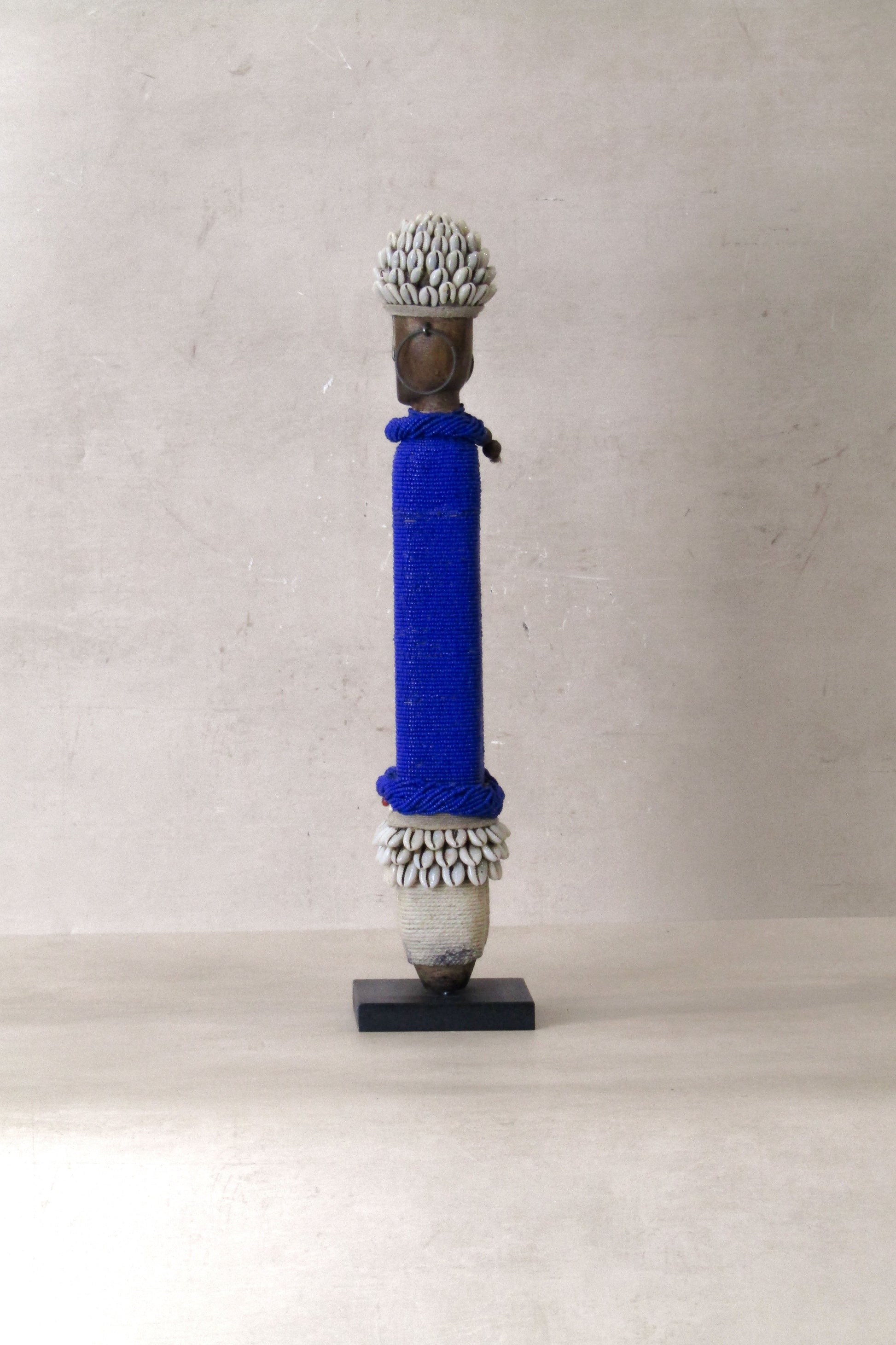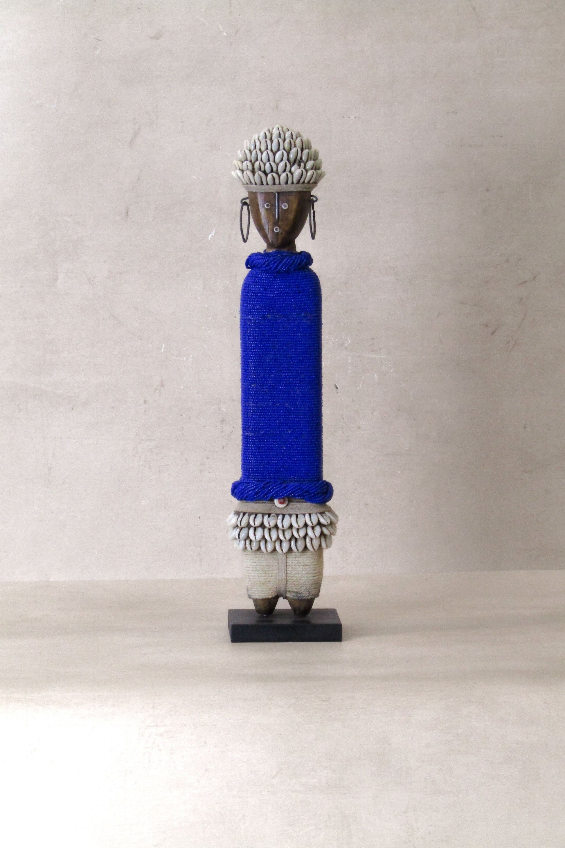 Namchi/Namji dolls are carved from African Rosewood, a legume tree native to the Democratic Republic of Congo, Cameroon, Gabon and Equatorial Guinea. A single block of African Rosewood wood is hand carved into a geometric shape and decorated with multi coloured beads, metals, fibre, cowrie shells, coins, and even leather. Each doll is carved with a unique stature and facial expression. Unadorned dolls made by blacksmiths are played with by young children.