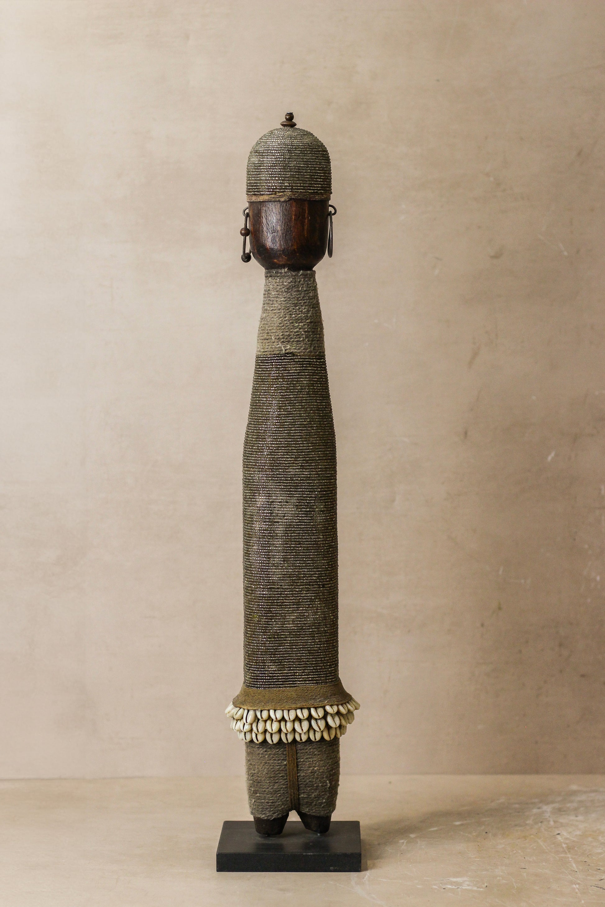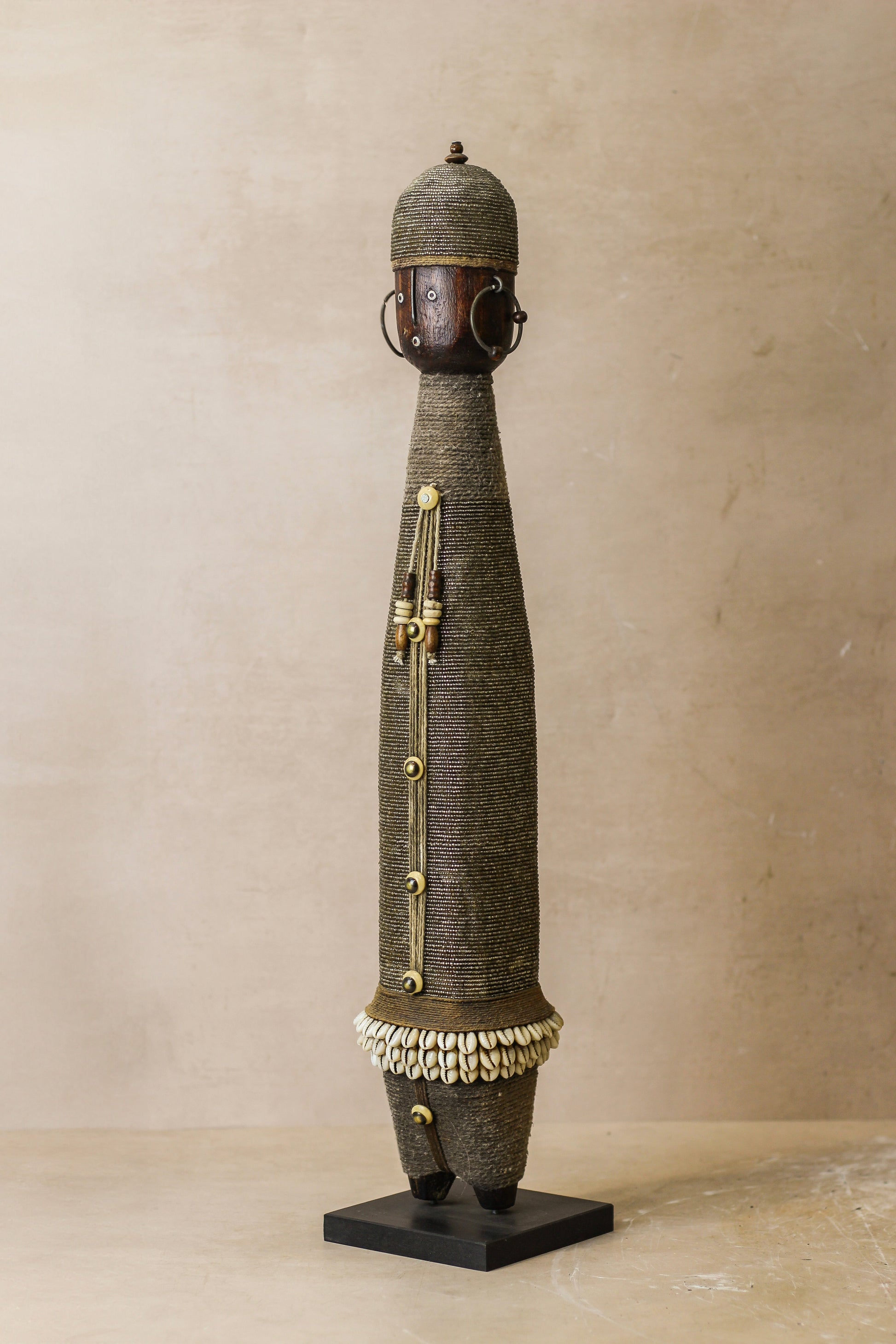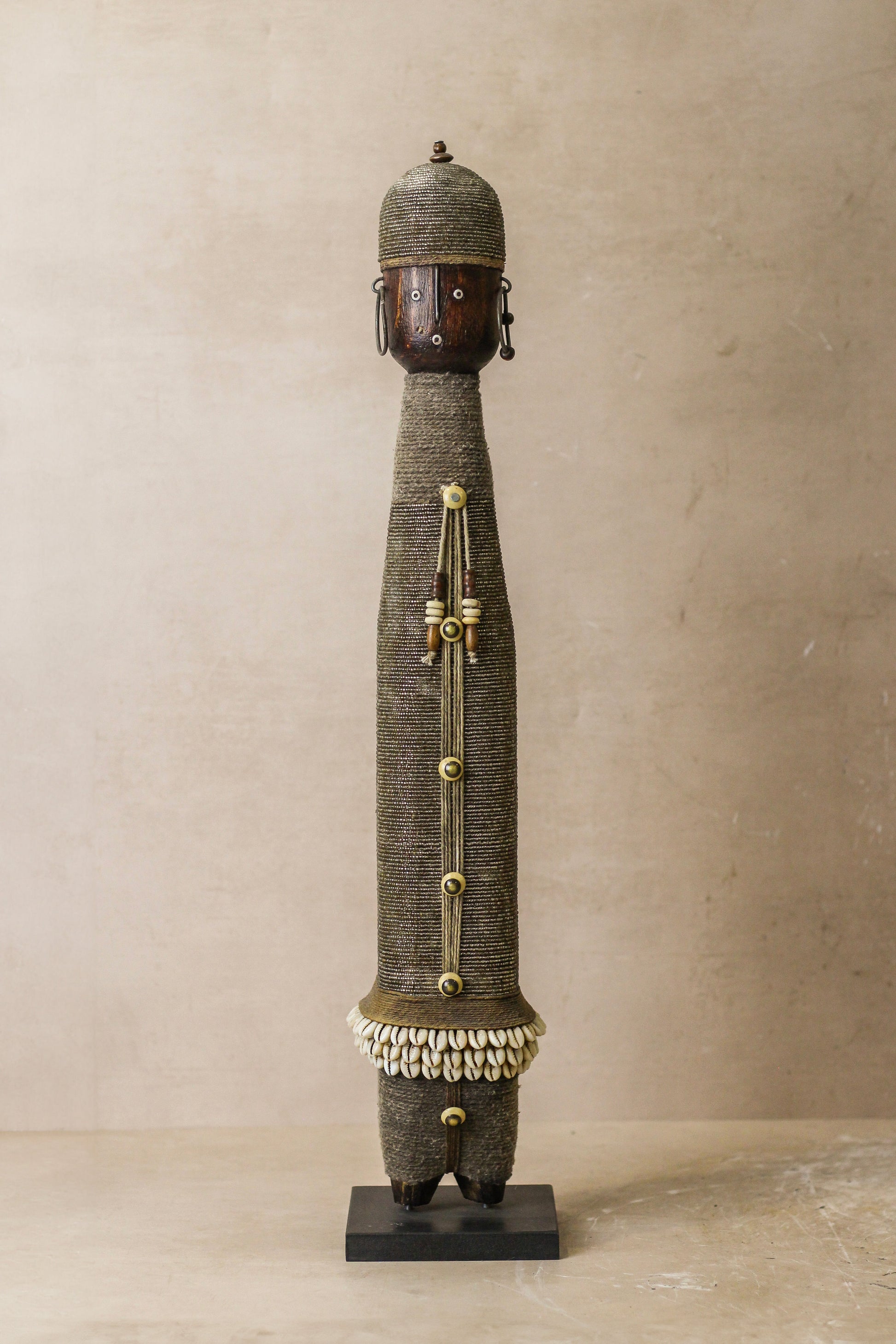 Historical Detail : Namchi/Namji dolls are carved from African Rosewood, a legume tree native to the Democratic Republic of Congo, Cameroon, Gabon and Equatorial Guinea. A single block of African Rosewood wood is hand carved into a geometric shape and decorated with multi coloured beads, metals, fibre, cowrie shells, coins, and even leather. Each doll is carved with a unique stature and facial expression. Unadorned dolls made by blacksmiths are played with by young children.