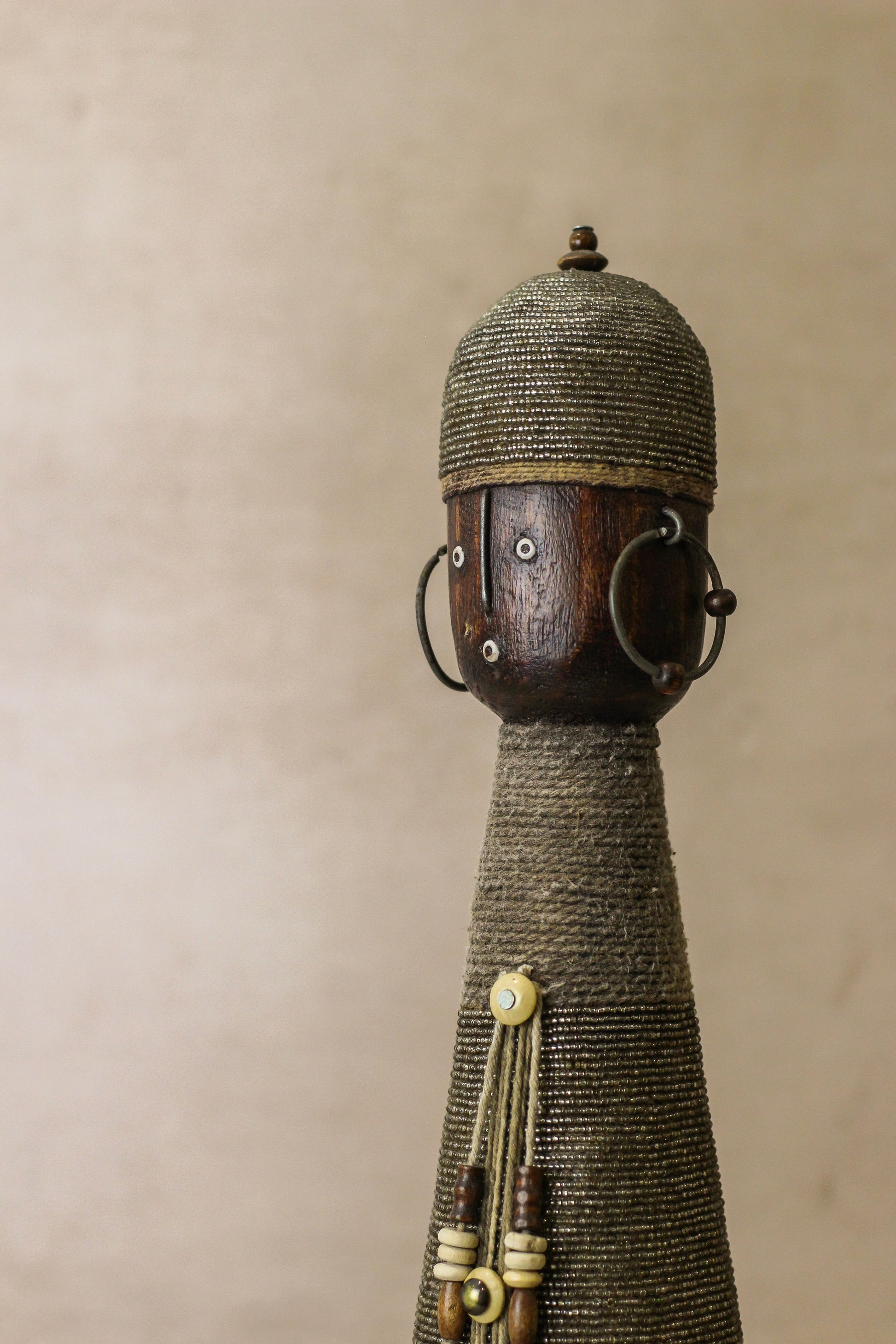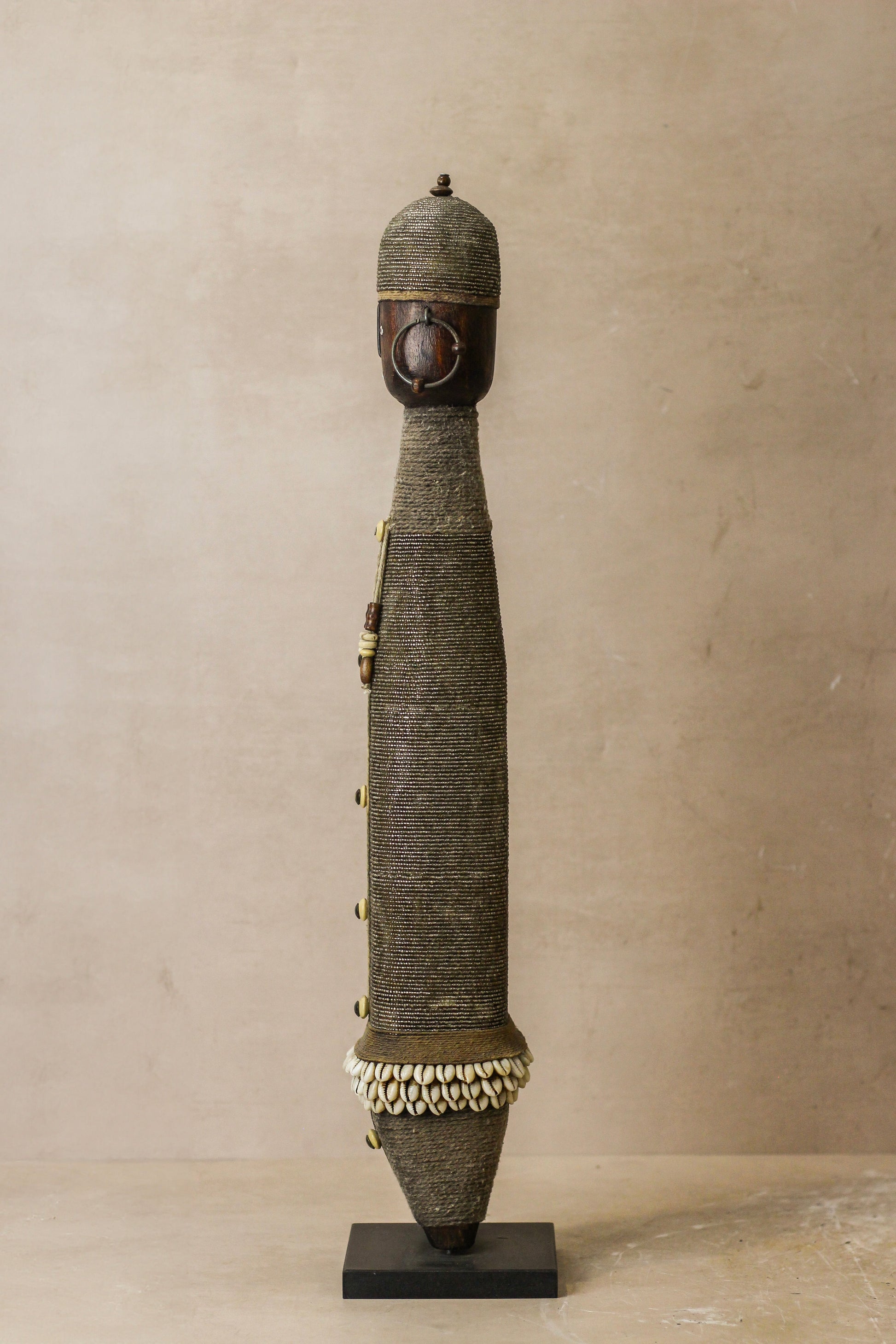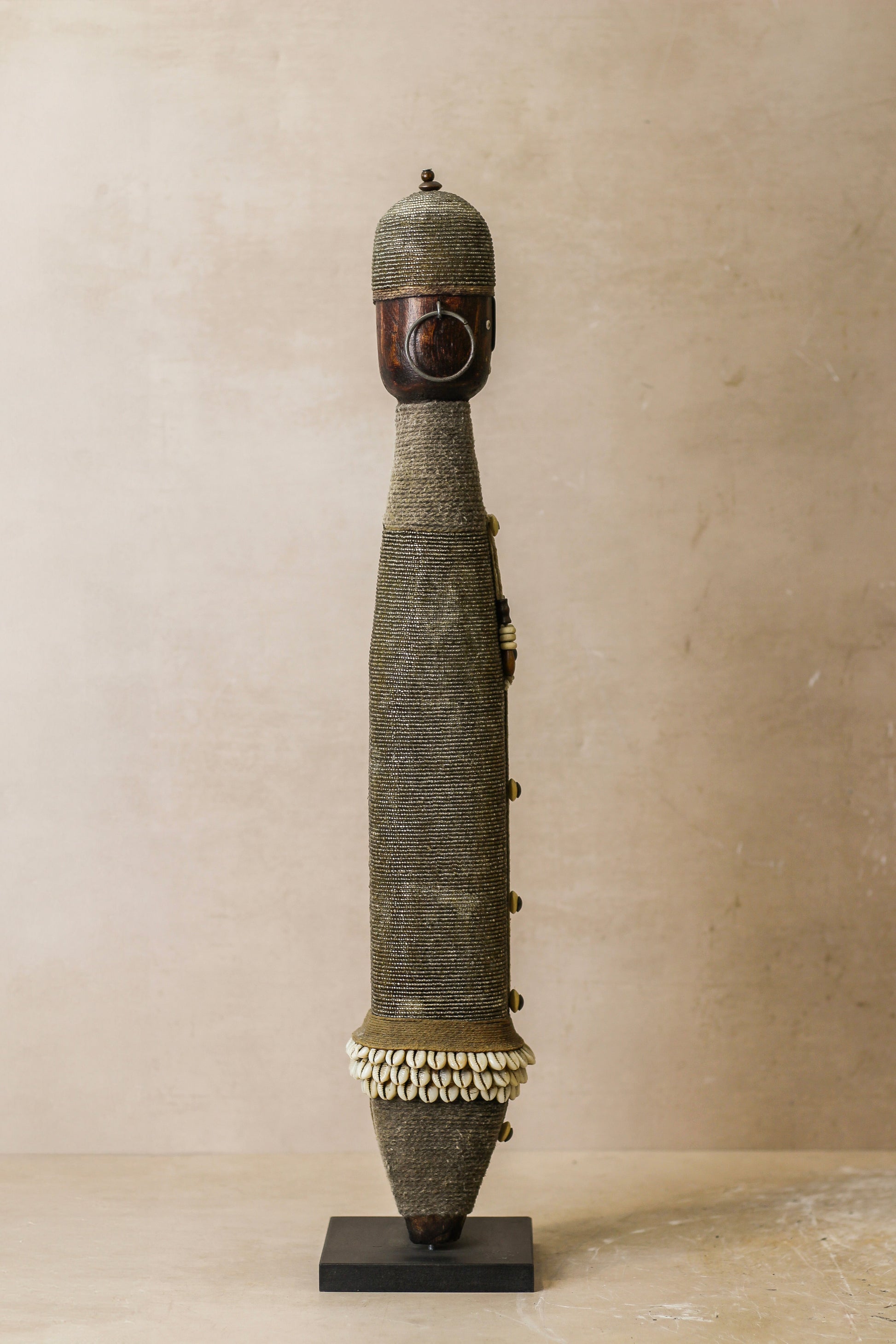 Historical Detail : Namchi/Namji dolls are carved from African Rosewood, a legume tree native to the Democratic Republic of Congo, Cameroon, Gabon and Equatorial Guinea. A single block of African Rosewood wood is hand carved into a geometric shape and decorated with multi coloured beads, metals, fibre, cowrie shells, coins, and even leather. Each doll is carved with a unique stature and facial expression. Unadorned dolls made by blacksmiths are played with by young children.