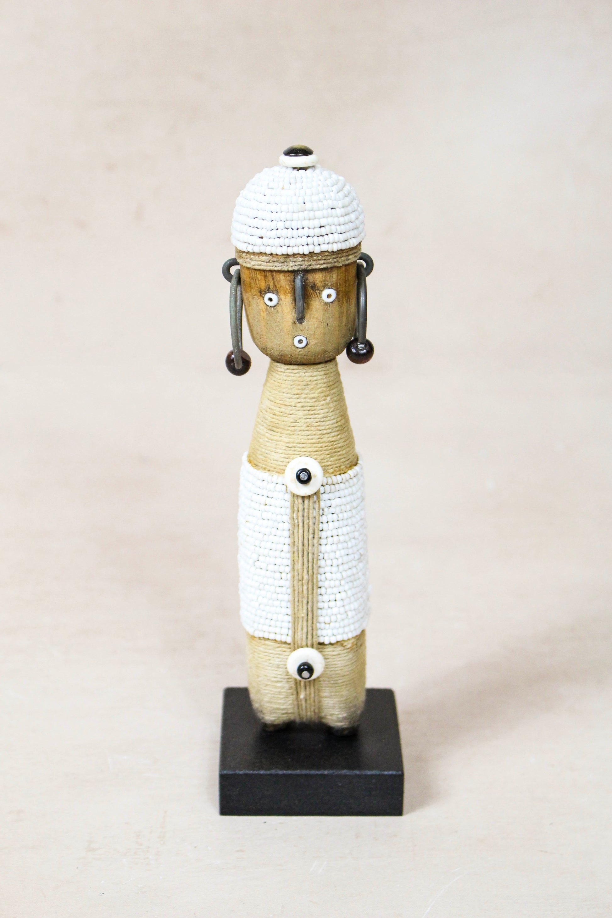 Namchi/Namji dolls are carved from African Rosewood, a legume tree native to the Democratic Republic of Congo, Cameroon, Gabon and Equatorial Guinea. A single block of African Rosewood wood is hand carved into a geometric shape and decorated with multi coloured beads, metals, fibre, cowrie shells, coins, and even leather. Each doll is carved with a unique stature and facial expression. Unadorned dolls made by blacksmiths are played with by young children.