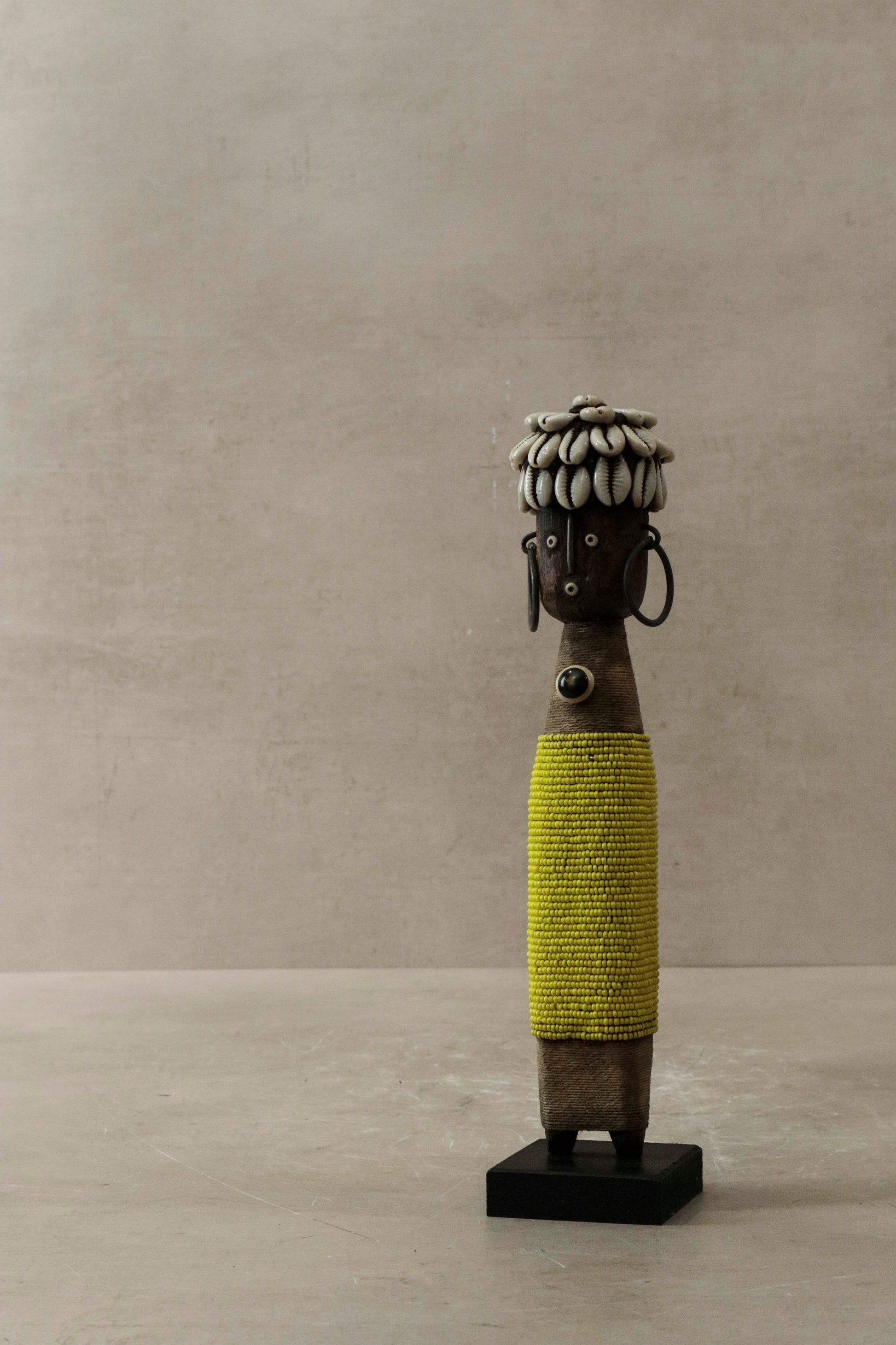 Intricate Adornments: The doll is adorned with multi-colored beads, metals, fibers, cowrie shells, coins, and leather, each element thoughtfully placed to enhance its aesthetic appeal. These embellishments not only add to its beauty but also reflect traditional practices.