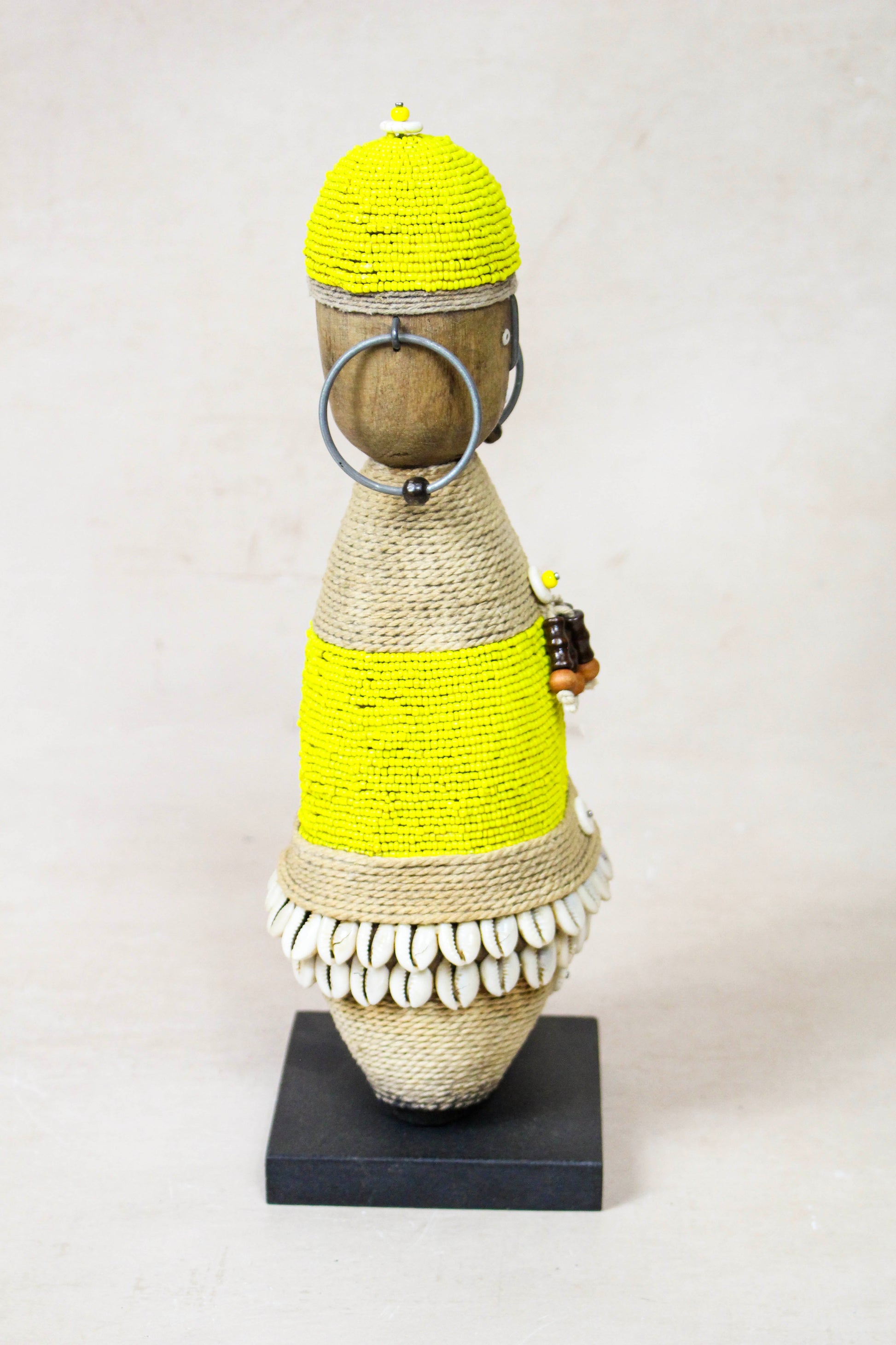 Intricate Adornments: The doll is adorned with multi-colored beads, metals, fibers, cowrie shells, coins, and leather, each element thoughtfully placed to enhance its aesthetic appeal. These embellishments not only add to its beauty but also reflect traditional practices.
