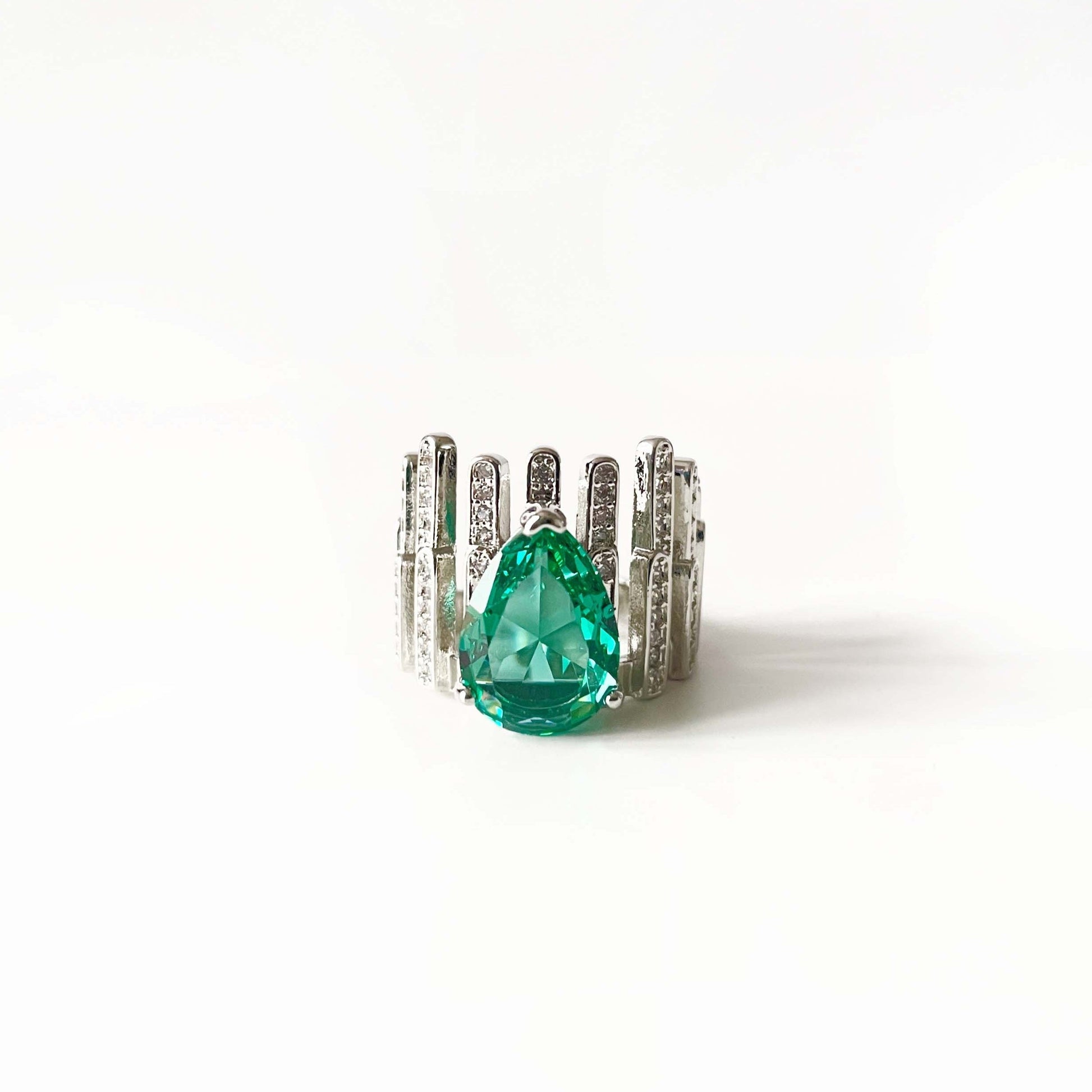 This cocktail ring with its large aqua glass stone is a true eye-catcher on the wearer’s finger. The stunning azure colour stone and the surrounding gems sparkle particularly intensely when the light hits making it perfect for the party season.