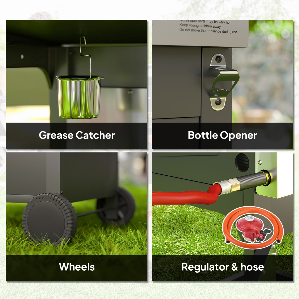 ● Weight Capacity: (grill grate) 10 kg, (bottom shelf) 20 kg, (side shelf) 5 kg