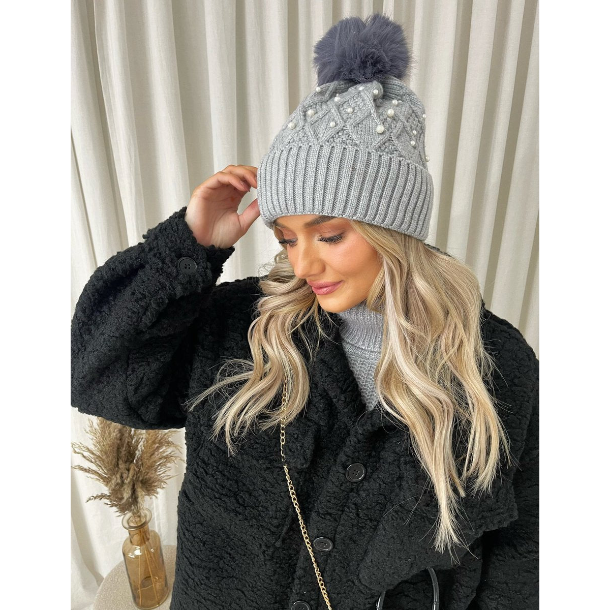 Pom Pom Knitted Winter Hat With Pearl Decor