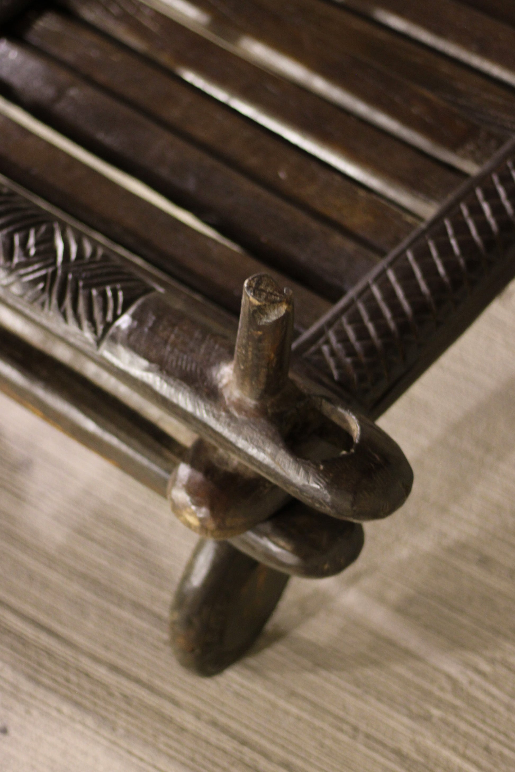 Historic Details: This exquisite piece is a true masterpiece of creative carpentry, handcrafted by the Pygmy people from the lush jungles straddling the Congo and Cameroon. Traditionally used as a bed, it reflects an intimate connection to nature and resourcefulness, carved with simple tools from a single, dense slab of native hardwood. Its low, elongated form has a smooth, timeworn surface that tells stories of generations. Each curve and contour showcases skilled craftsmanship, blending both form and function with elegance. While it once served as a place of rest, this piece effortlessly transforms into a unique coffee table or a captivating piece of standalone art, bringing the spirit of the forest and cultural heritage into any room. Its raw, earthy presence and intricate natural grain make it not just furniture but a piece of history and art.
