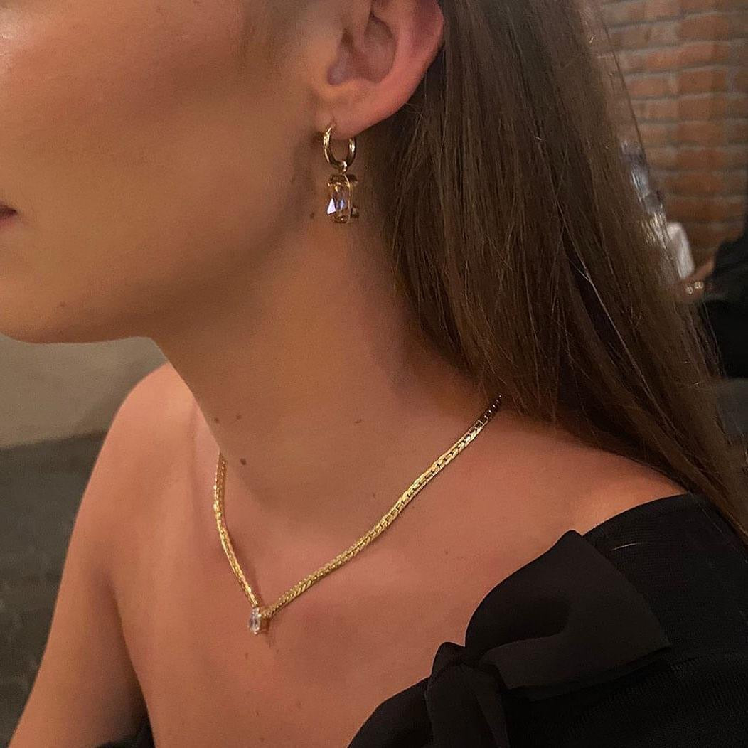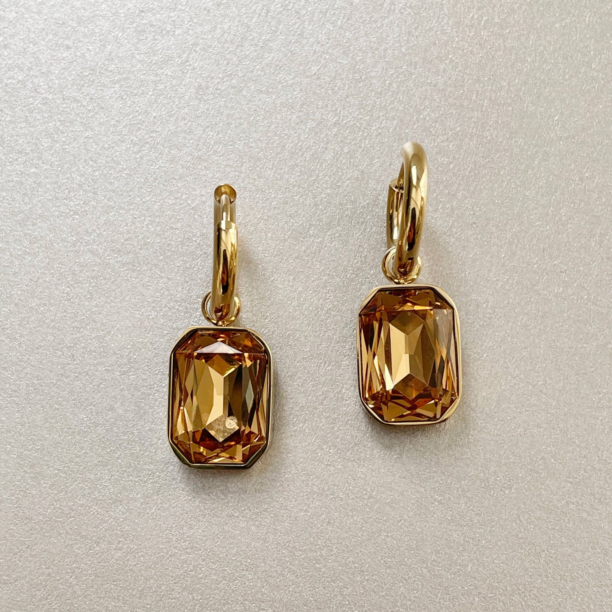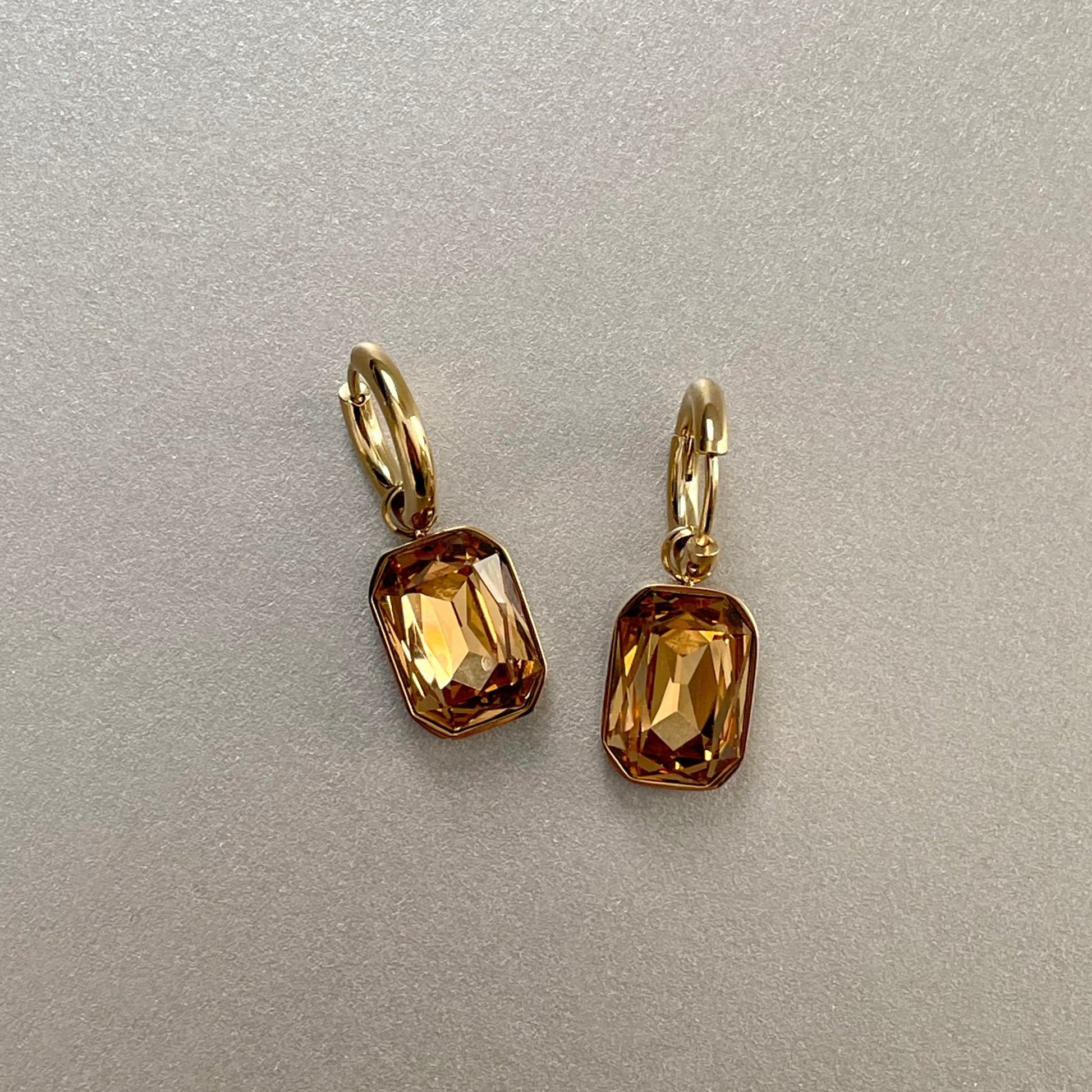 The Rani earrings are part of our new Luxe collection. They feature beautiful faceted amber coloured jewels suspended from gold toned huggie hoops.