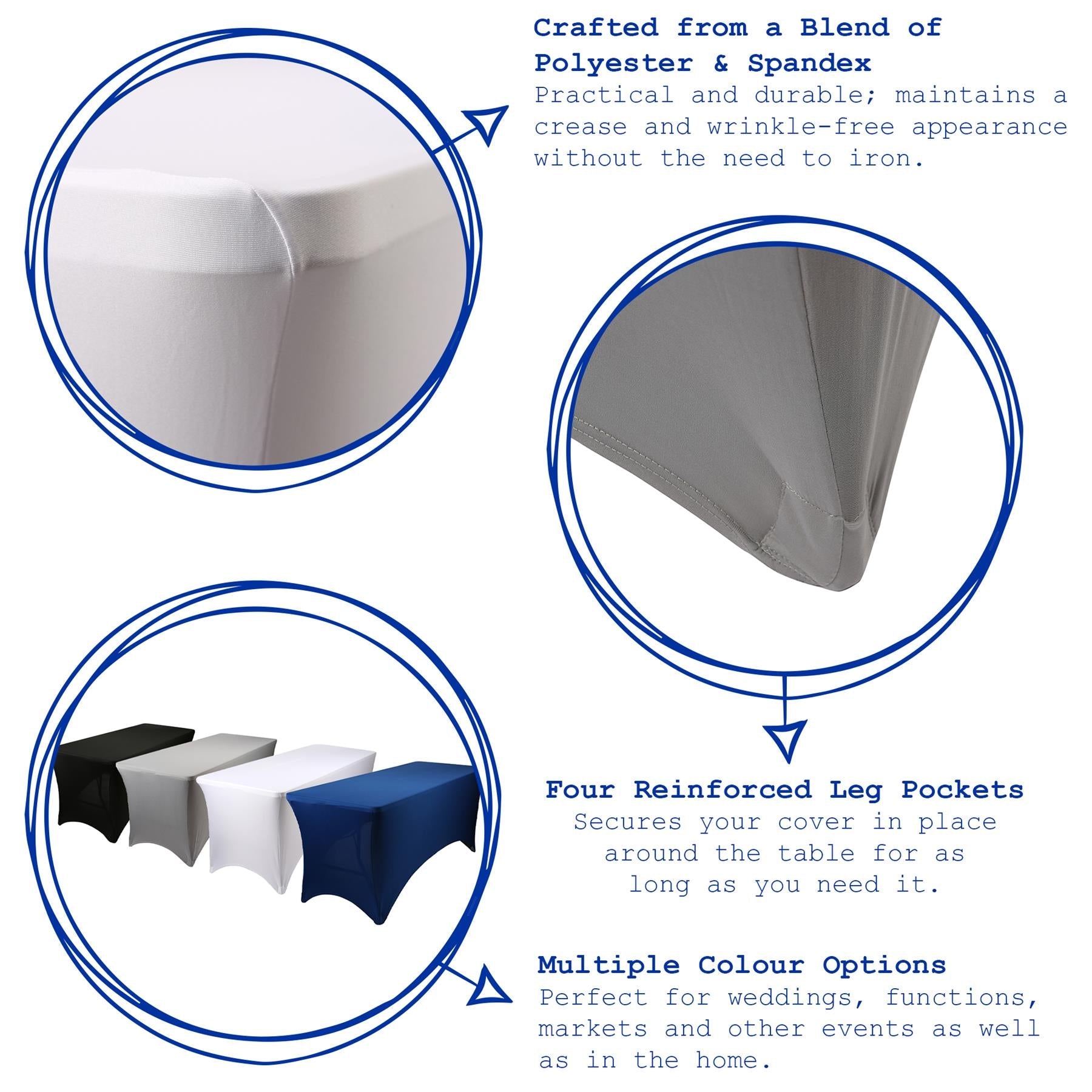 Each cover in our collection has been crafted from a blend of polyester and spandex, resulting in a practical and durable product that maintains a crease and wrinkle-free appearance without the need to iron.