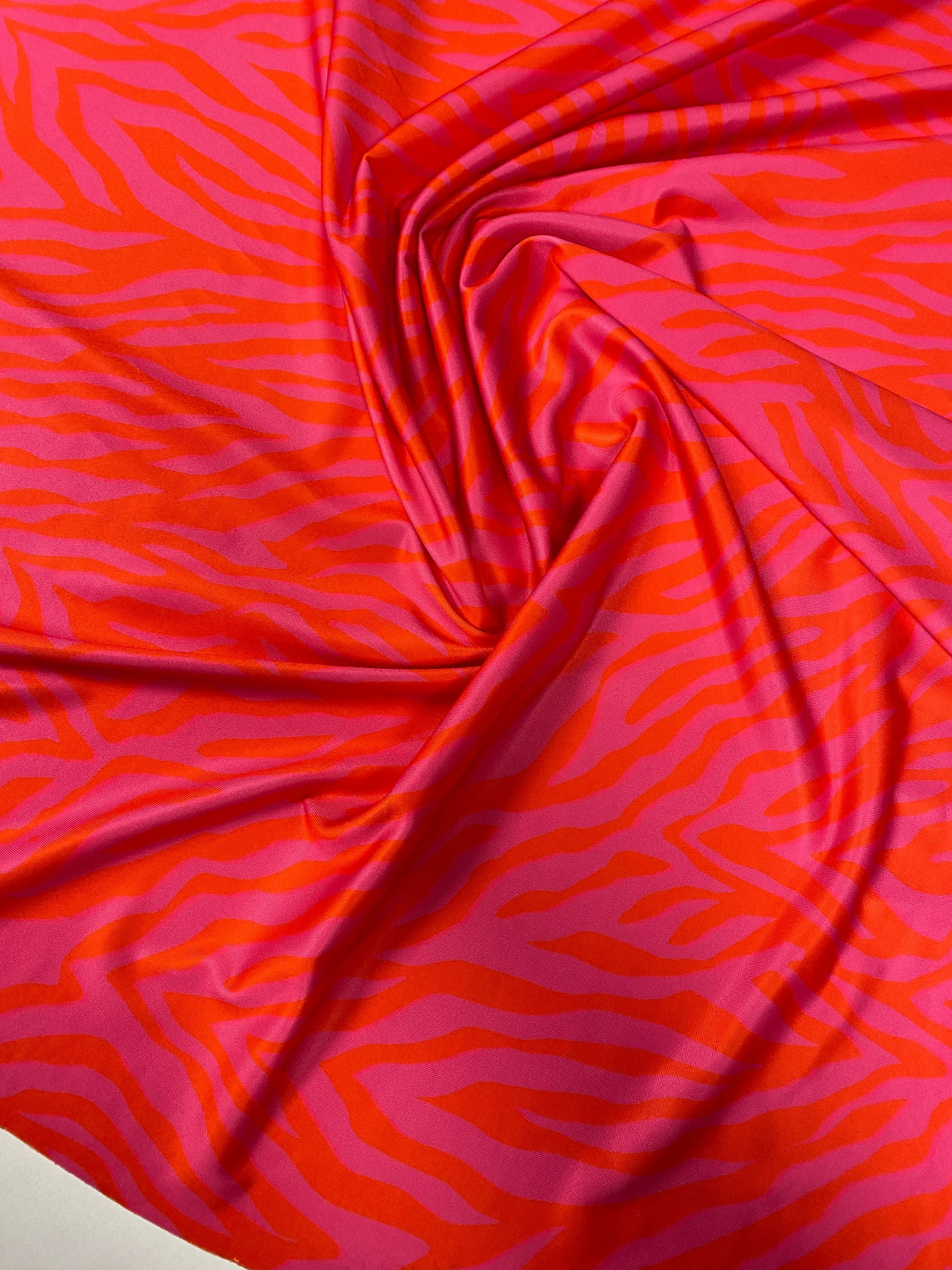 Bold zebra print spandex fabric in vibrant red and pink tones. Perfect for statement fashion, costumes, leggings, and creative DIY projects.