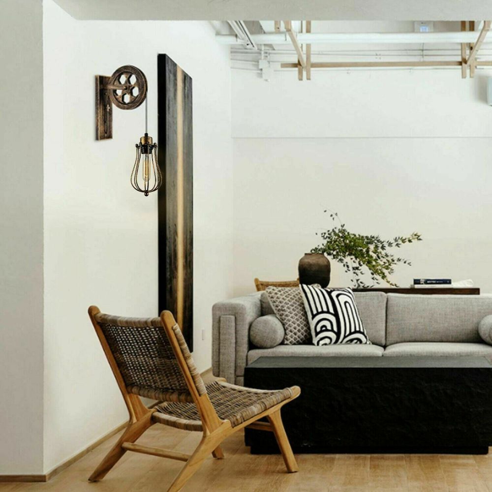 Retro Industrial Pulley Wheel Wall Light Fixture Metal Cage Indoor Light