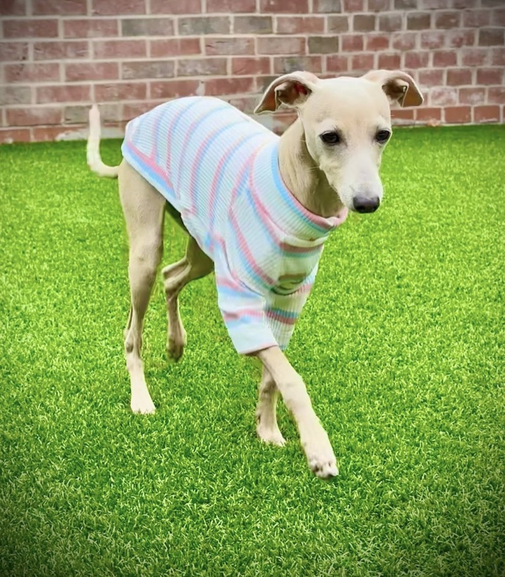 Our Iggy Suits two-legged t-shirt in white, pink and blue.