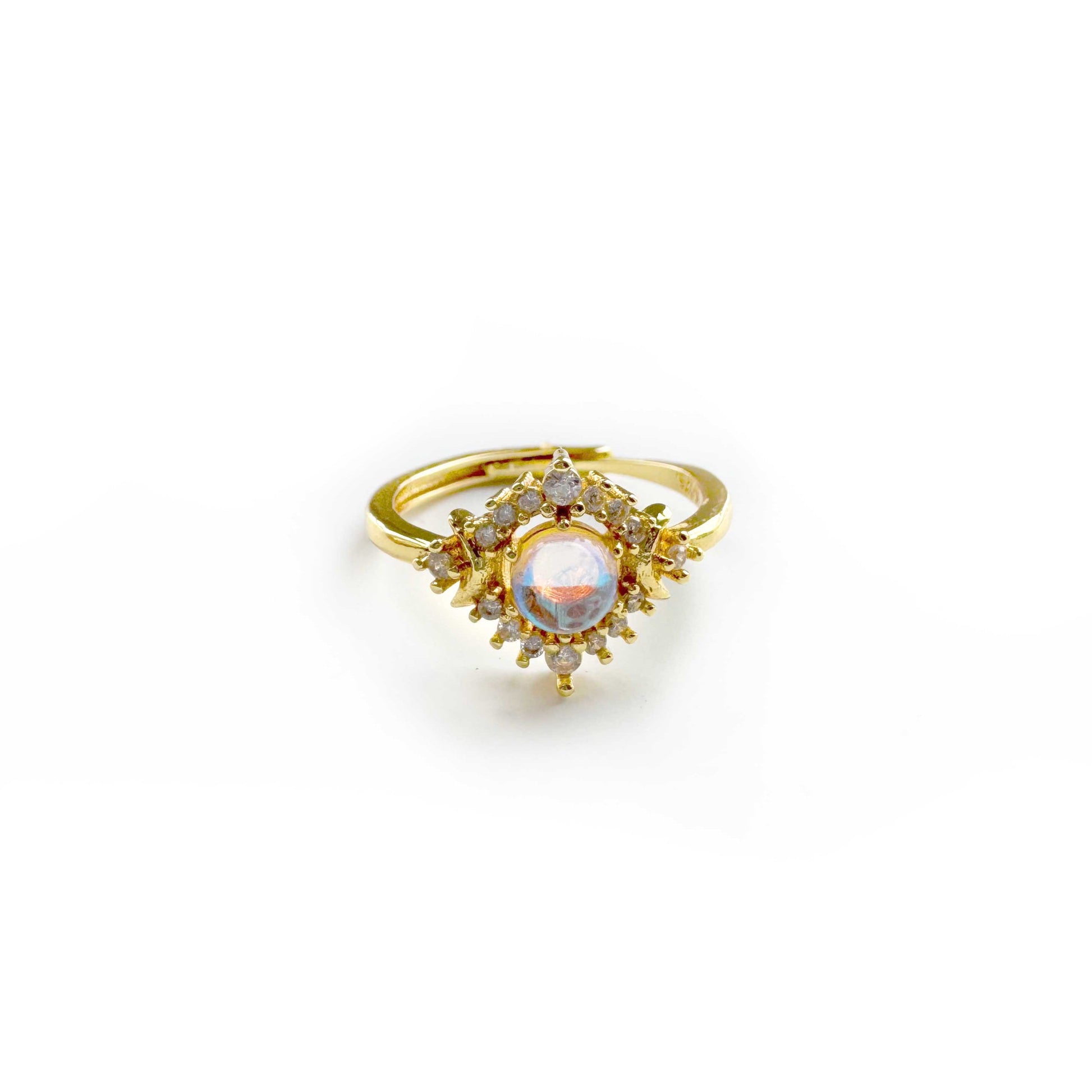 Embrace celestial elegance with the Selene Ring, a moonstone ring inspired by the moon goddess. Featuring a radiant, ethereal synthetic moonstone at its center, this statement ring captures the soft glow of moonlight. Surrounded by a halo of shimmering crystal accents and set in an intricate gold-tone band, the Selene Ring exudes timeless sophistication. Perfect for lovers of moon-inspired jewelry, it’s a symbolic accessory that brings mystical charm and refined beauty to any occasion. Ideal for everyday wear or as a thoughtful gift for those who adore celestial designs.