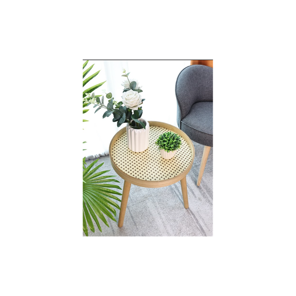 SHLEDECOR Cane Side Table With Rattan Circle Round Table - Solid Matte Oak Finish Legs - Sofa Table Stool End Table