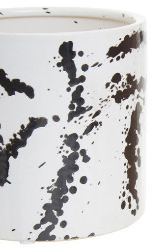 A smooth white ceramic body features painterly splash motifs in inky black, creating a lively contrast that feels modern and artful. Gentle texturing gives the surface depth, catching light across the curved profile. The petite round shape sits neatly on trays and book stacks, adding interest without clutter.