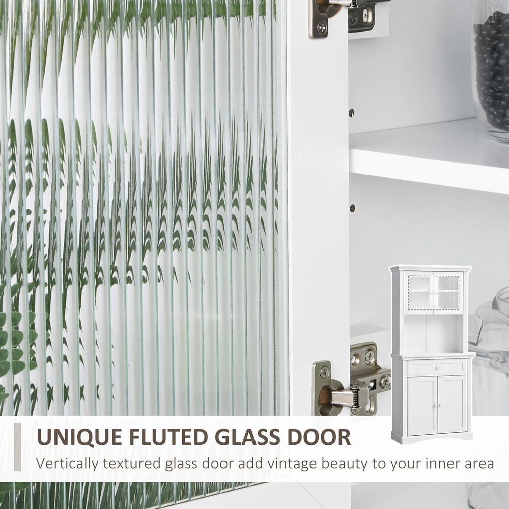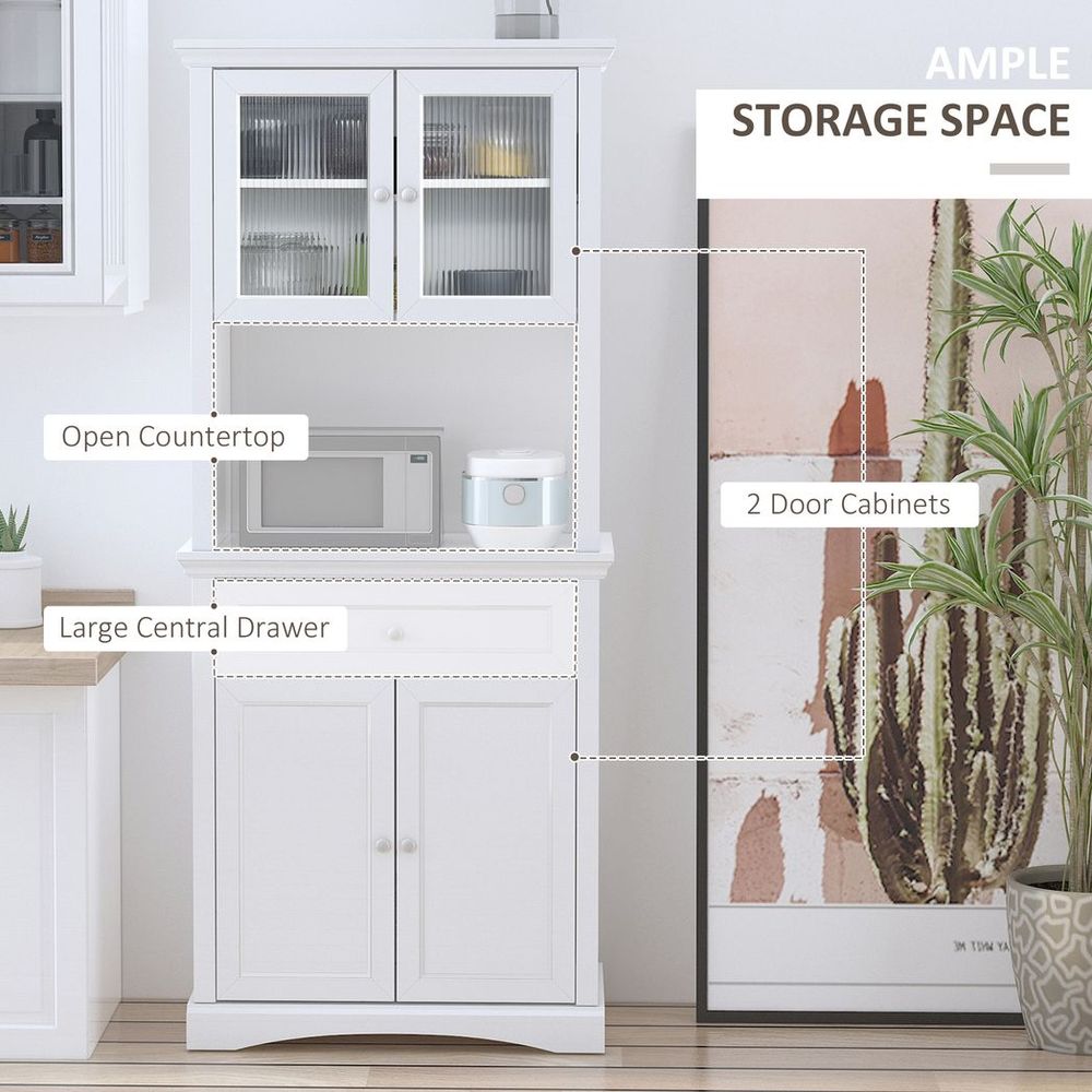 Tall Kitchen Cupboard with Glass Doors, Adjustable Shelves, Open Counter, White