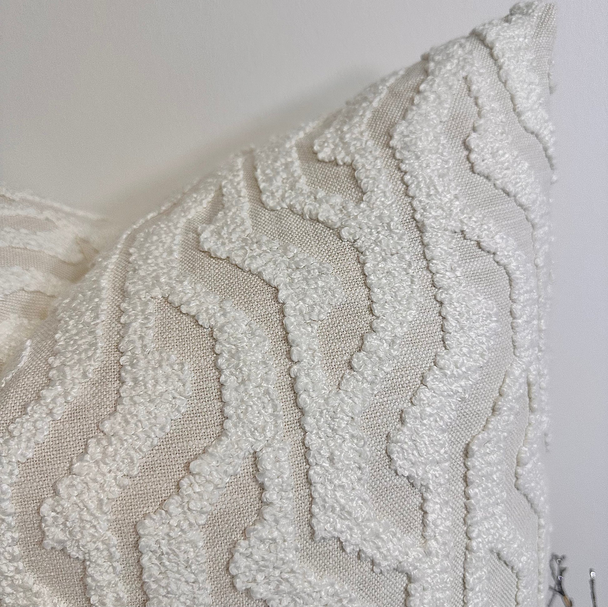 This ivory luxury boucle cushion incorporates a beautiful textured finish. On a beautiful linen fabric, its stunning ivory colour and structure really emphasises its depth with the sumptuous texture running through.