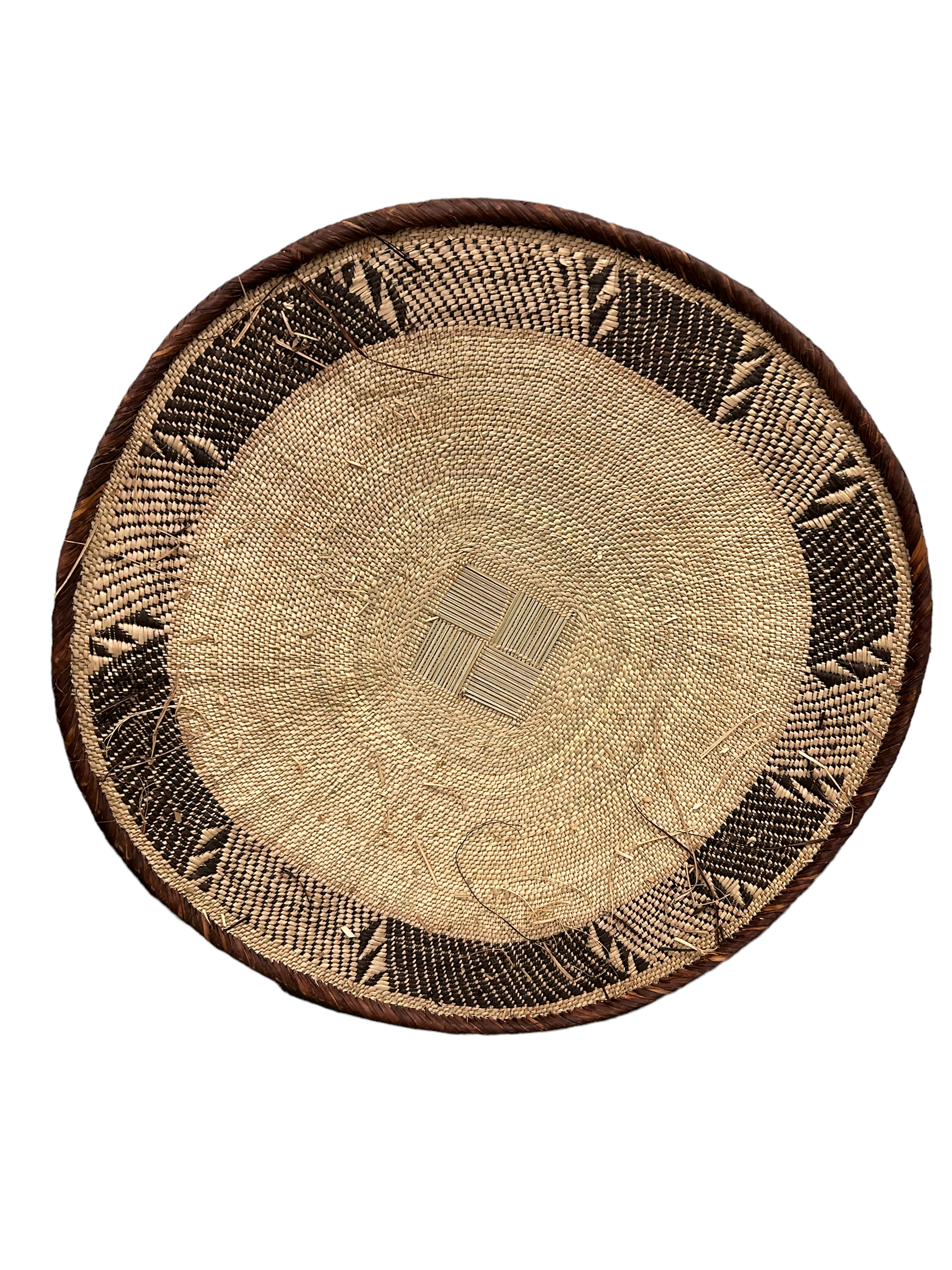 These solid-edged baskets are the apex of the Bathonga people basket maker’s art in Zimbabwe and Southern Zambia. The baskets made from the Ilala palm leaf start as a woven square and end up almost perfectly round. The pattern on the edging is referred to as “snake’s belly”, as the pattern resembles the scales of a serpent. Palm fibres are died using tree bark to make fibres with different colours. The design is very functional, as the baskets are used to winnow grain even today. The baskets are sometimes called “grandmother