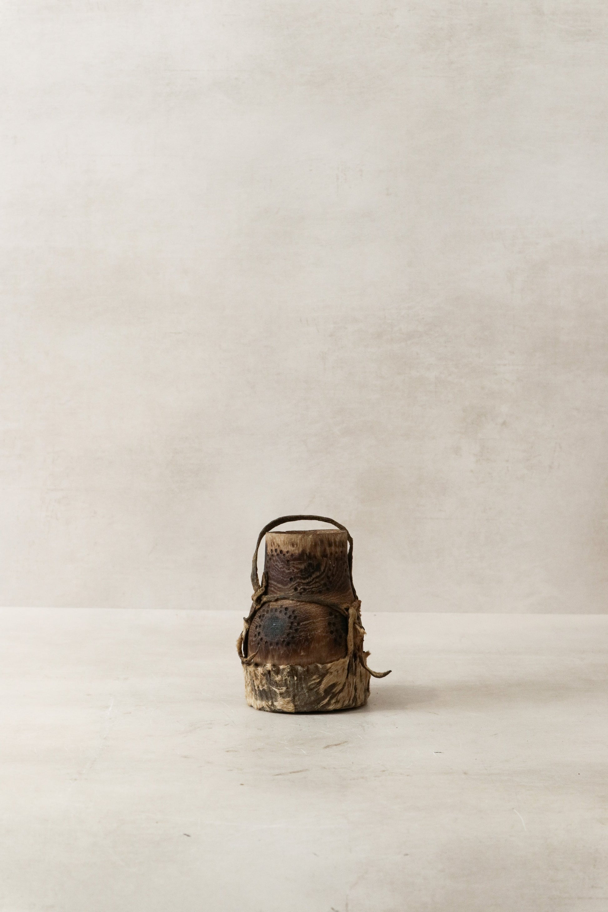 These honey containers are hand carved by the Turkana people from Kenya and used to store honey. Each container is unique and goat leather is used to add to the functionality of this item often as lids, straps to carry around and adornments making these stunning pieces. These pieces show a beautiful patina due to the age of this item.