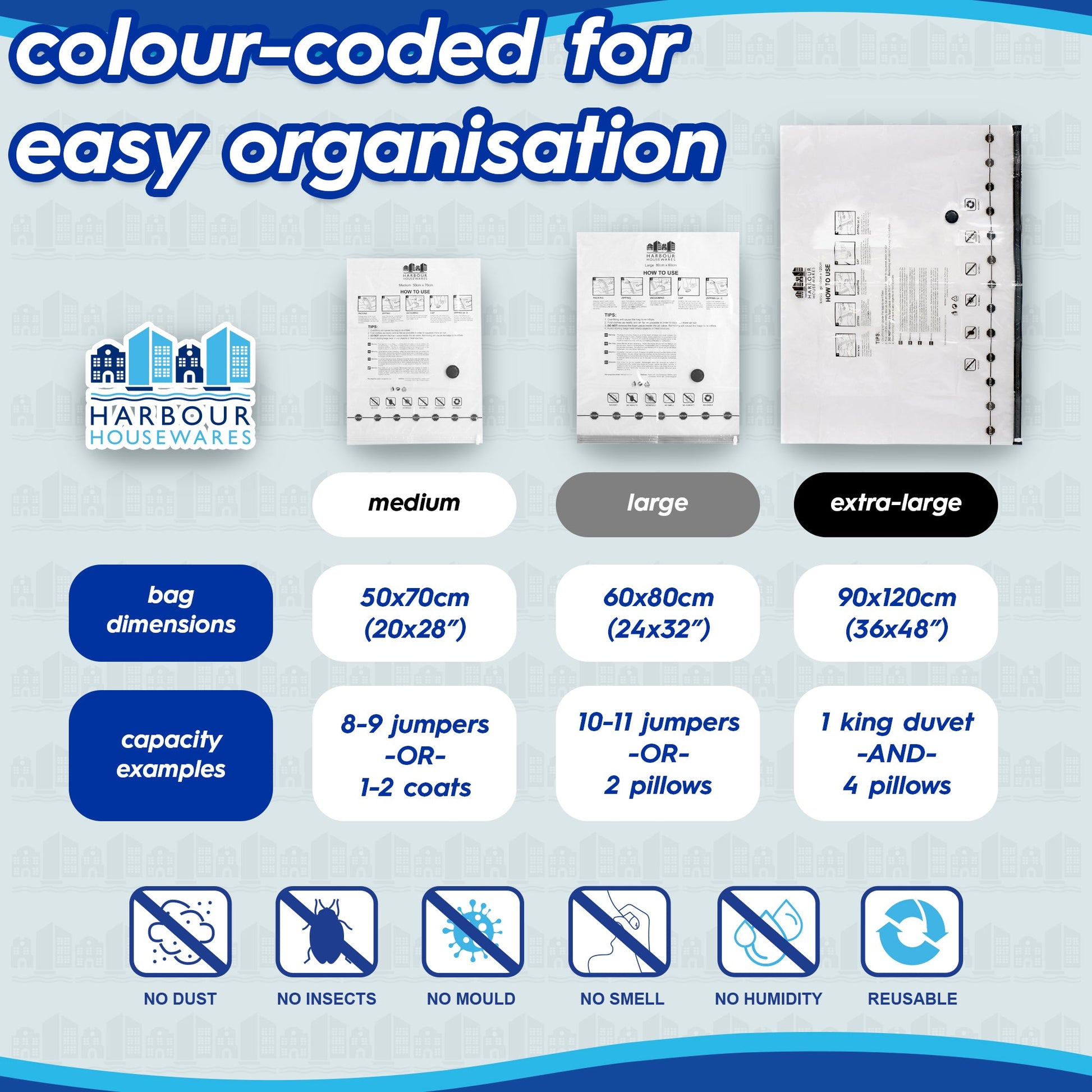 These Vacuum Storage Bags from Harbour Housewares offer an exceptional space-saving solution for clothes, blankets, bed linens and more, whether at the top of the wardrobe or at the bottom of a suitcase!