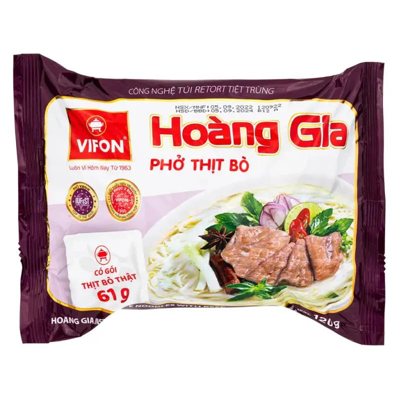 Enhance your meal with VIFON HOANG GIA Instant Pho Noodles With Beef 120g. Made with high quality ingredients, this quick and easy meal option provides a delicious combination of savory beef and flavorful rice noodles. Enjoy the convenience and taste without compromising on quality.