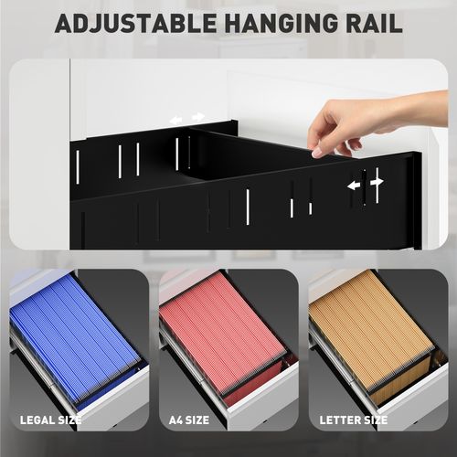 ● Adjustable rail in large drawer for A4, legal and letter-sized files